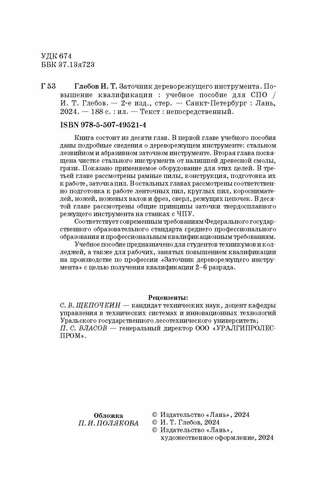 Заточник дереворежущего инструмента. Повышение квалификации (Глебов Иван Тихонович); Лань, 2023