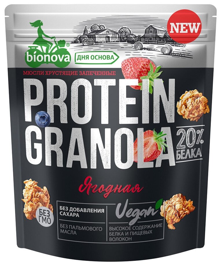 Протеиновая гранола Bionova Ягодная отличается высоким содержанием белка в сочетании с медленными углеводами и пищевыми волокнами цельного зерна. Это готовый к употреблению, сбалансированный, вкусный и полезный завтрак либо перекус, в который можно добавлять обычное или растительное молоко, кефир или йогурт на ваш вкус. Готовы к употреблению. По желанию можно добавить молоко, йогурт или сок.
