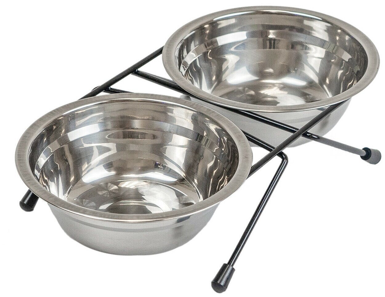 Кормушка напольная с двумя мисками из нержавеющей стали. Для собак мелких пород, щенков и кошек. Предназначена для единовременного размещения корма и воды при кормлении. Может применяться как в домашних, так и в уличных, или в походных условиях. Особенно удобна при содержании и кормлении животного в клетке, в поездках, при выездах с животным на природу. Кормушка компактная и лёгкая. Устойчивая подставка металлическая сварной конструкции имеет прочное полимерное покрытие (окрашена порошковым методом). Для предотвращения скольжения и в целях травмобезопасности ножки кормушки снабжены пластиковыми наконечниками. Цвет подставки чёрный.