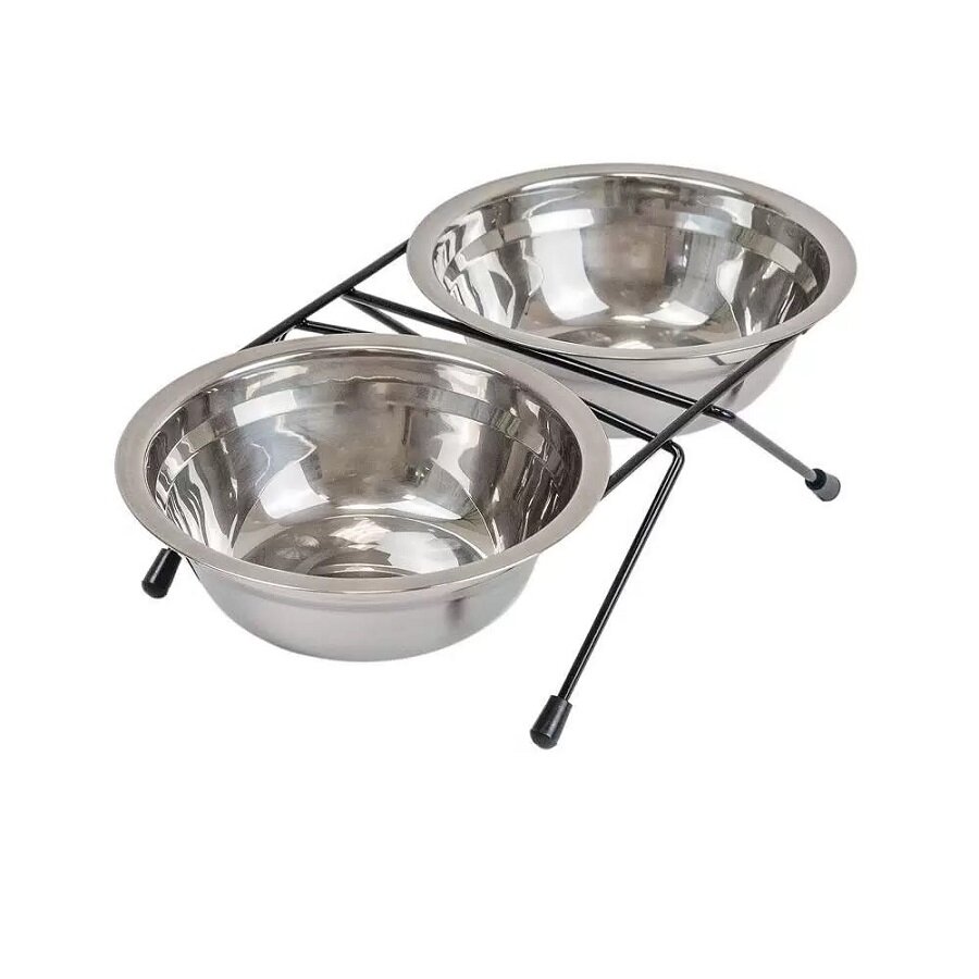 Кормушка напольная с двумя мисками из нержавеющей стали. Для собак мелких пород, щенков и кошек. Предназначена для единовременного размещения корма и воды при кормлении. Может применяться как в домашних, так и в уличных, или в походных условиях. Особенно удобна при содержании и кормлении животного в клетке, в поездках, при выездах с животным на природу. Кормушка компактная и лёгкая. Устойчивая подставка металлическая сварной конструкции имеет прочное полимерное покрытие (окрашена порошковым методом). Для предотвращения скольжения и в целях травмобезопасности ножки кормушки снабжены пластиковыми наконечниками. Цвет подставки чёрный.
