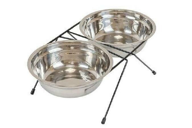 Кормушка напольная с двумя мисками из нержавеющей стали. Для собак мелких пород, щенков и кошек. Предназначена для единовременного размещения корма и воды при кормлении. Может применяться как в домашних, так и в уличных, или в походных условиях. Особенно удобна при содержании и кормлении животного в клетке, в поездках, при выездах с животным на природу. Кормушка компактная и лёгкая. Устойчивая подставка металлическая сварной конструкции имеет прочное полимерное покрытие (окрашена порошковым методом). Для предотвращения скольжения и в целях травмобезопасности ножки кормушки снабжены пластиковыми наконечниками. Цвет подставки чёрный.