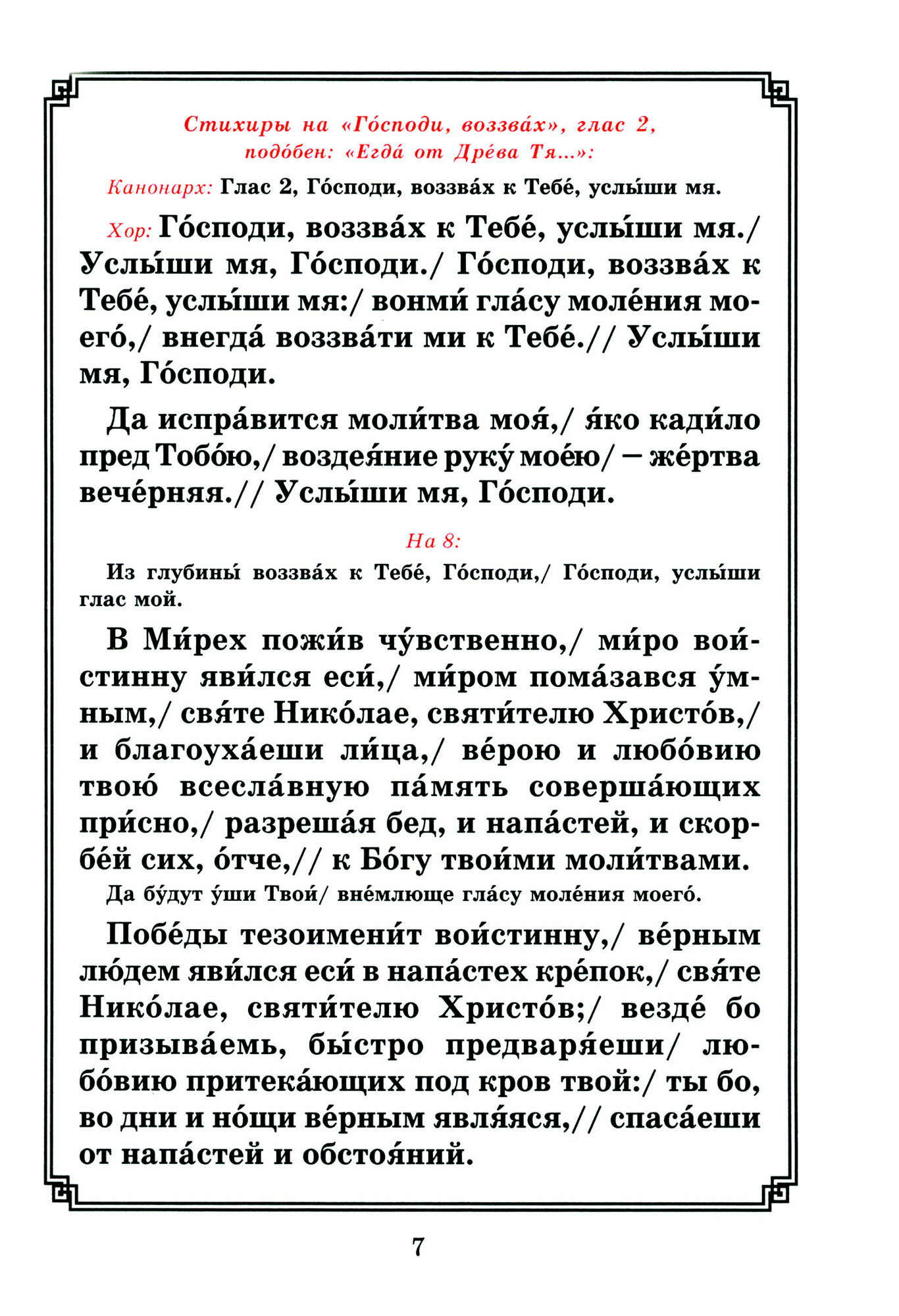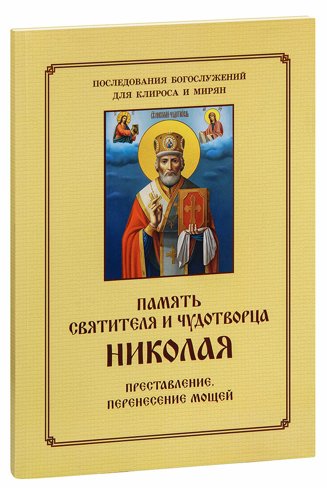 В первой части книги содержится последование Всенощного бдения на преставление свт. Николая 6/19 декабря, а также изменяемые песнопения праздничной Литургии. Во второй части - последование на перенесение мощей святителя 9/22 мая с уставными указаниями и текстами песнопений святителю.