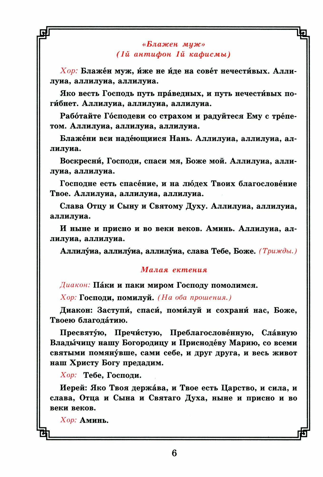 Неизменяемые нотные песнопения и текст чтеца набраны средним шрифтом, а изменяемые песнопения - укрупненным, с ударениями и разметкой для пения.
