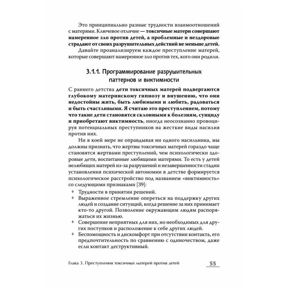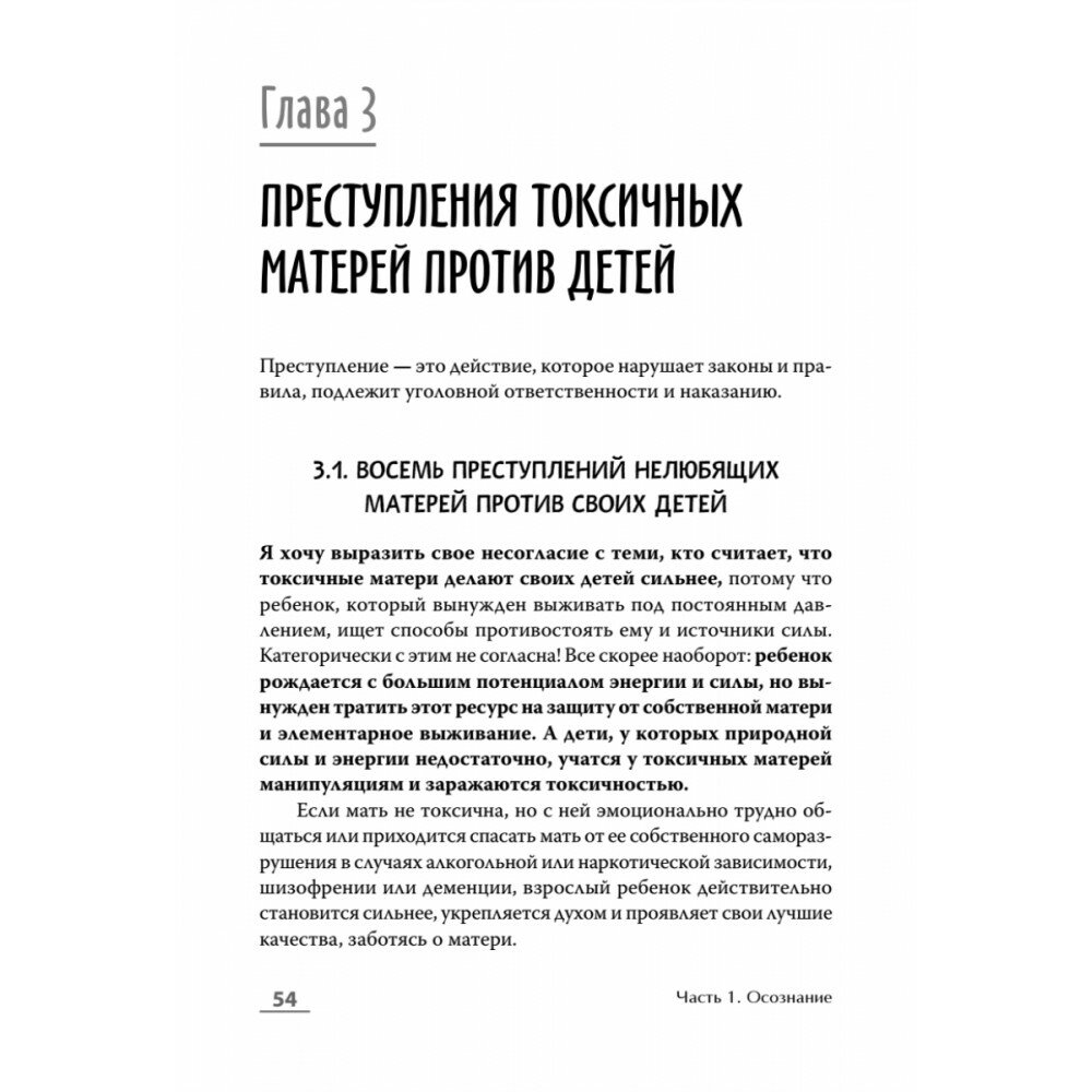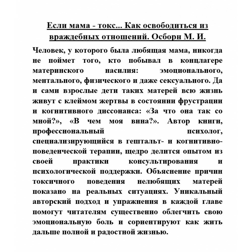 Хорошо, что такая важная проблема, как токсичные взаимоотношения матерей и детей стали освещаться всё больше и больше. В данной книге действительно есть много полезных рекомендаций о том, как себя вести в подобной ситуации, из которых читатели могут подобрать для себя наиболее подходящие. Но эта книга не рассчитана на тех, у кого нет возможности съехать от родителя-токса из-за особенностей искалеченной психики, отсутствия денежных средств и образования, потому что все практики рассчитаны на отсутствие рядом на одной жилплощади человека, который выедает душу. П.С. Лабковский, Кирьянова и Курпатов, упоминаемые в книге в позитивном ключе - это, всё таки, по большей части крупные инфоцыгане, а так называемое, \"советское воспитание\", о котором тоже упоминает автор, считая его токсичным, вполне себе было и до СССР, и после него, и вне СССР ). \"Да и насчёт утверждения \"Яйца курицу не учат\" как-то мутно... Во всяком случае - прочитать можно, полезностей много.