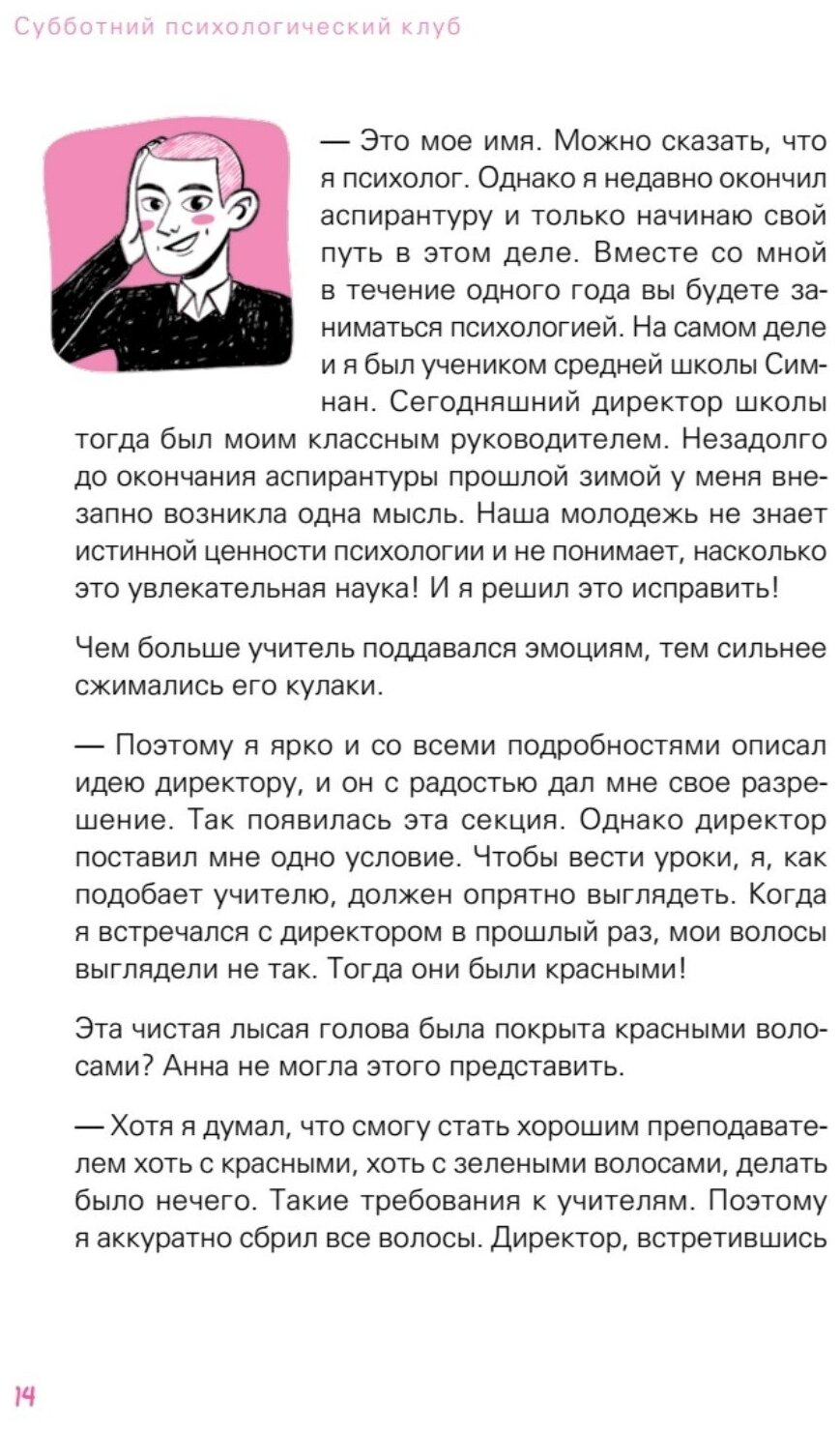 Очень увлекательный и интересный формат познакомить ребенка с психологией и рассказать много удивительных экспериментов, интегрируя их в, казалось бы, обычный рассказ о жизни школьников. Книга ориентирована на 12+. Субботний психологический клуб - это клуб, в который ходят главные герои рассказа, чтобы пройти новые интересные эксперименты, где они постепенно узнают о том, как можно тренировать свой мозг, как перестать откладывать дела на потом, как быстрее запоминать новый материал, как научиться контролировать тревожные мысли, поверить в себя и тд. Вся история крутится вокруг главной героини, которая имеет свойственные своему школьному возрасту переживания, кризисы и проходит становление себя как личности. Если вы дадите своему 12-летнему ребенку книгу, отвечающую на те же самые вопросы, однако это будет просто адаптированная психология, больше половины просто отложит ее в дальний ящик, учитывая и так уже большую школьную нагрузку, однако в школьных учебниках о таком не рассказывают, по крайней мере в России, хотя подобная информация в таком возрасте нужна как никогда. Но если вы вручите рассказ о таких же подростках, об их школьной жизни, где ребенок узнает собственные переживания, то это будет не только расслабляюще и интересно, но и полезно, ведь предстоящие занятия Субботнего психологического клуба ваш ребенок будет проходить вместе с героями. Кроме того, рассказ происходит в Корее, что так же познакомит читателя с новой страной и менталитетом, которые сейчас, кстати, занимают первые полосы в чартах. Уверена, что потом вам еще придется слушать пересказы этих экспериментов, потому что удивительной информации там действительно много!