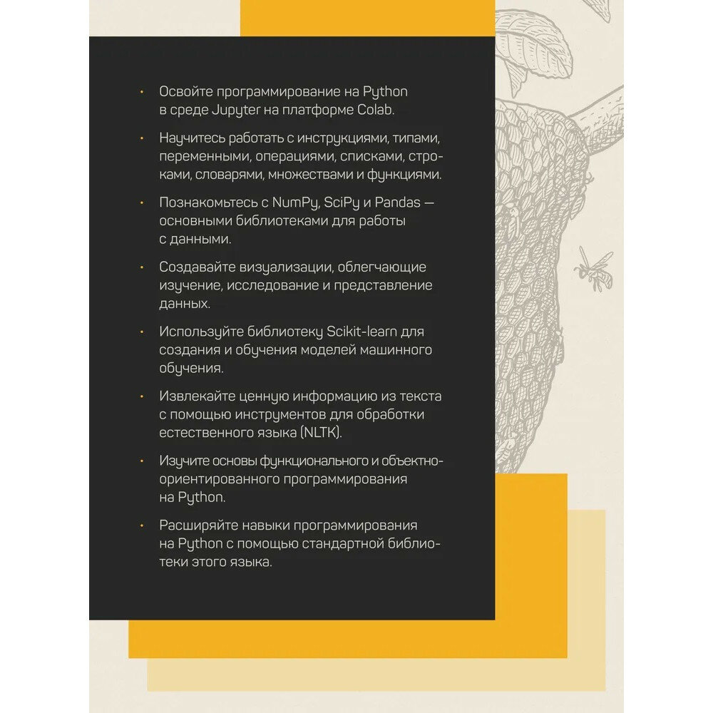 Вы познакомитесь с блокнотами Jupyter - лучшей средой для профессиональной работы с данными. Затем перейдете к ключевым библиотекам, которые упрощают процесс математических вычислений, визуализации, решение задач машинного обучения и обработки естественного языка. Затем, овладев основами, вы перейдете к продвинутым техникам, позволяющим решать более сложные задачи.