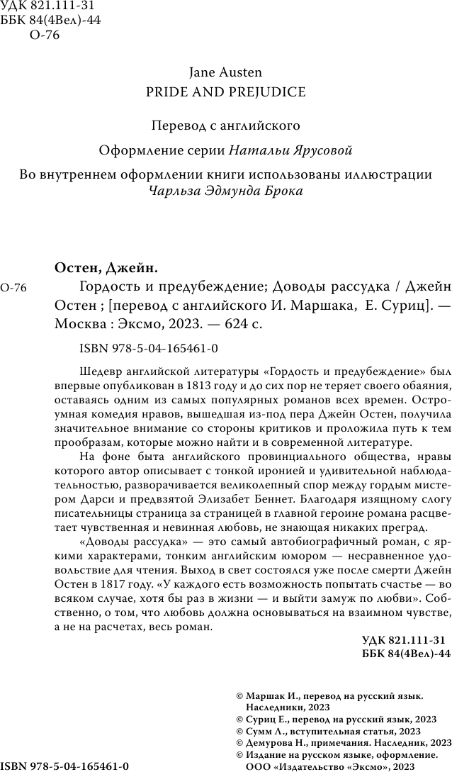 «Гордость и предубеждение» дан в каноническом и любимом читателями переводе И. Маршака, а «Доводы рассудка» — в переводе Е. Суриц. Иллюстрации знаменитого художника Чарльза Эдмунда Брока. В издание также включены предисловие и примечания.