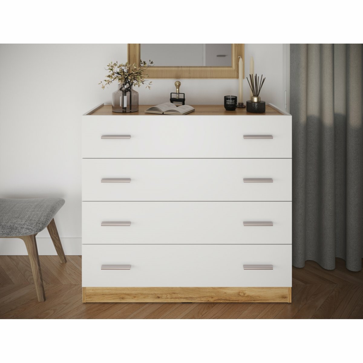 Комод — эффектная и вместительная модель для гостиной и спальни, которая позволит упорядочить хранение многих домашних вещей: столовых приборов, текстиля, аксессуаров, мелкой бытовой техники и документов. Сочетание ослепительно белых поверхностей и отделки под золотистый дуб беспроигрышно: белая мебель освежает интерьер и наполняет его светом, а контрастный древесный декор сделает помещение уютнее и наряднее. Крышка комода удобна для хранения даже мелких предметов: благодаря бортику им не грозит падение. Можно использовать изделие и для установки телевизора, причем даже моделей с большой диагональю.