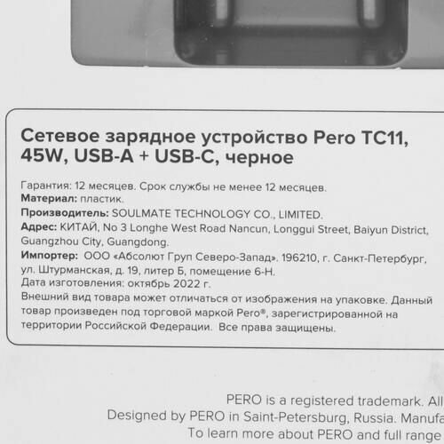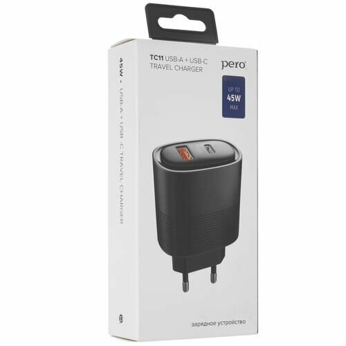 Сетевое зарядное устройство PERO TC11 USB-A QC3.0 + USB-C PD 45W черный