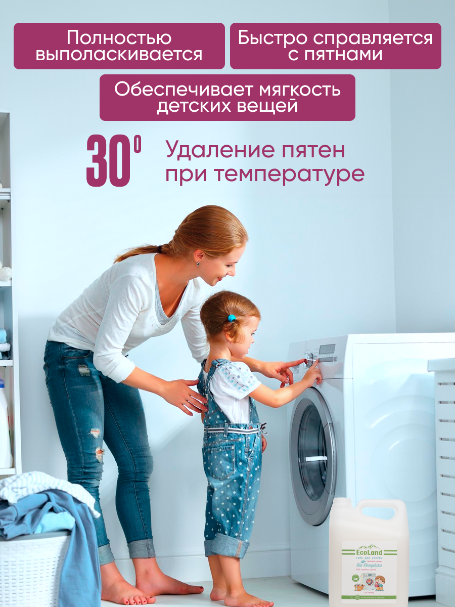 Гель для стирки детских вещей EcoLand разработан специально для стирки одежды и белья детей любого возраста. Гель для стирки детский, гипоаллергенный. Полностью растворяется в воде и выполаскивается из волокон ткани. НЕ СОДЕРЖИТ лауретсульфат натрия, агрессивные ПАВ, фосфаты, фосфонаты, активный хлор, красители.Высокая концентрация активных растительных ПАВ обеспечивает эффективную стирку белья и экономичный расход средства.Благодаря содержанию компонентов на основе растительное сырья детский гель EcoLand безопасен для окружающей среды. Не тестируется на животных. Отлично подходит для использования в домах с автономной канализацией.Гель для стирки детского белья EcoLand используется как для ручной, так и машинной стирки на любых режимах. Рекомендуемая температура для максимально эффективной стирки - от 40 до 90 градусов.