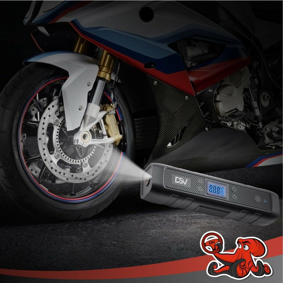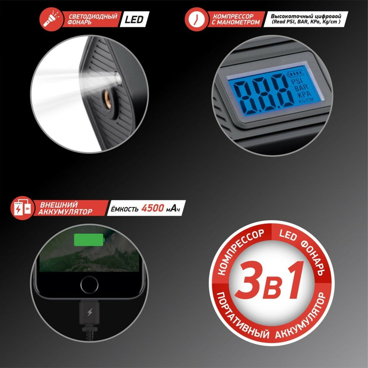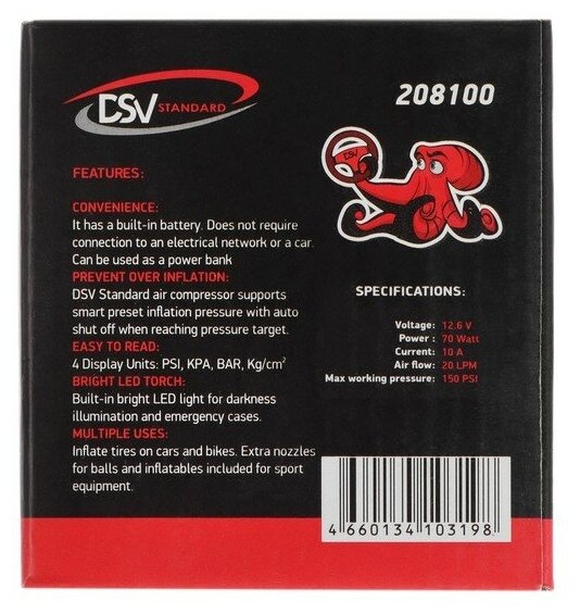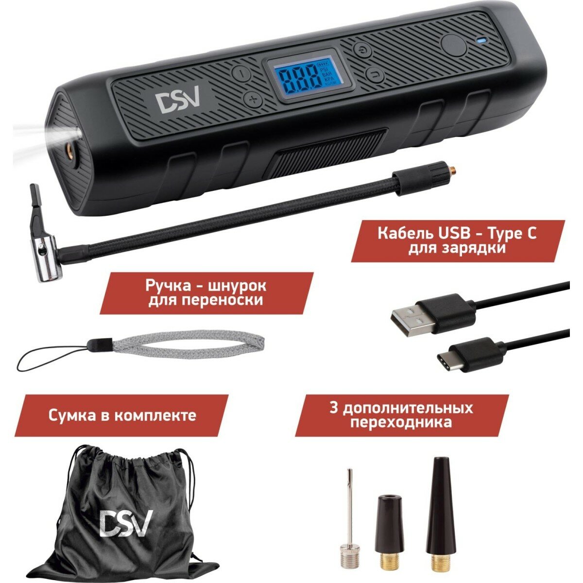 Беспроводной компрессор-PowerBank DSV 3в1 - помощник для вело-, мото- и автолюбителей. Не требует постоянного питания во время работы. Заряжается от кабеля USB, идущего в комплекте. Время автономной работы - 10 минут. Для комфортной работы в тёмное время суток компрессор оснащён светодиодным фонарём и ярким цифровым экраном. Для удобства хранения и переноски предусмотрен чехол.