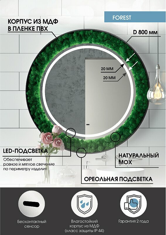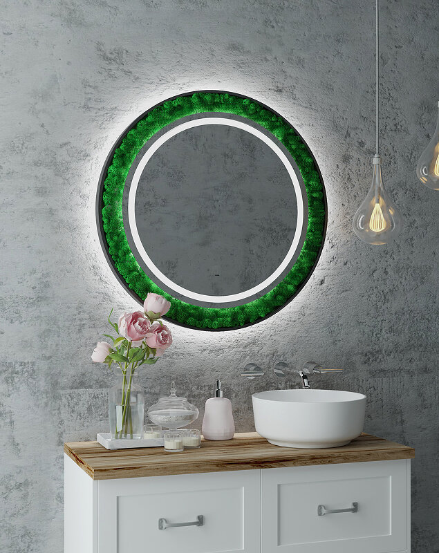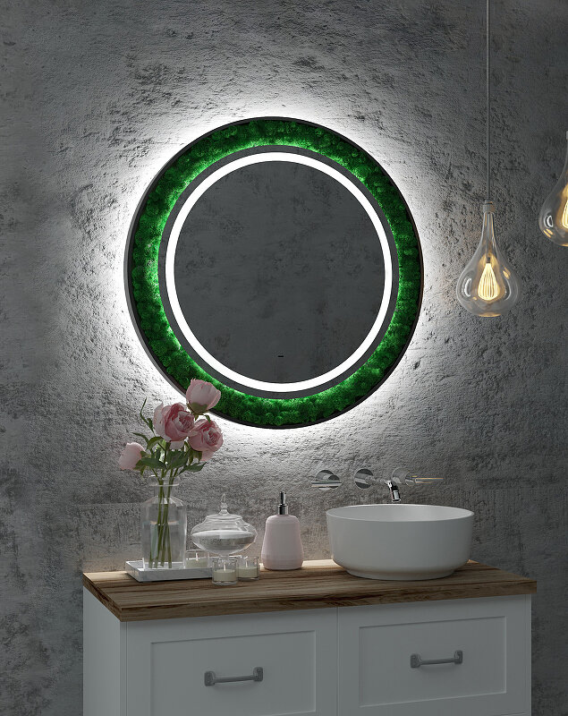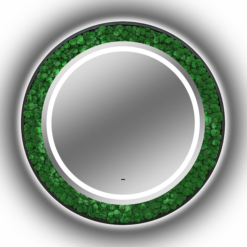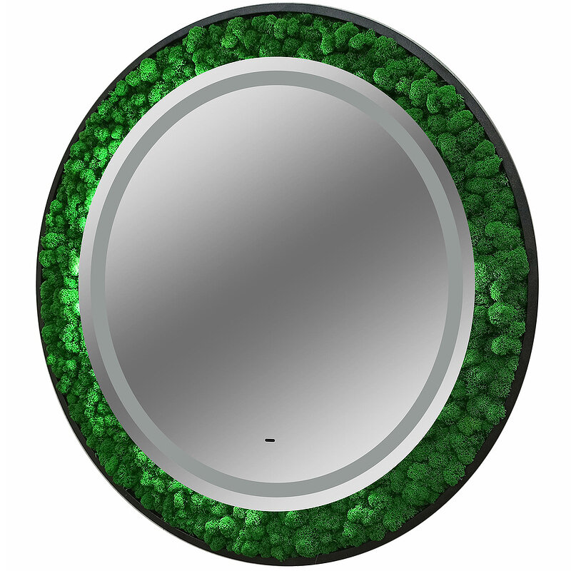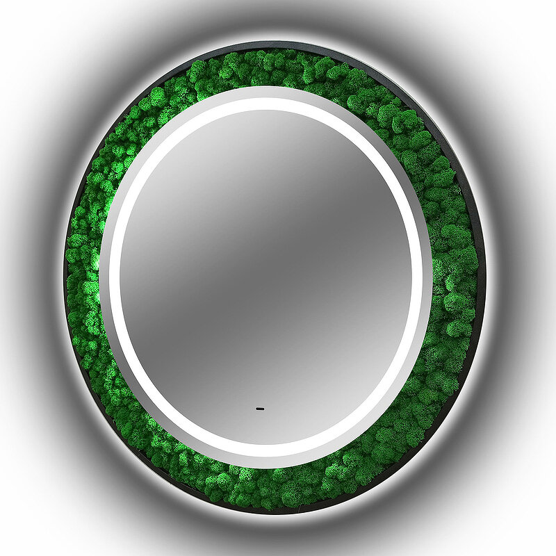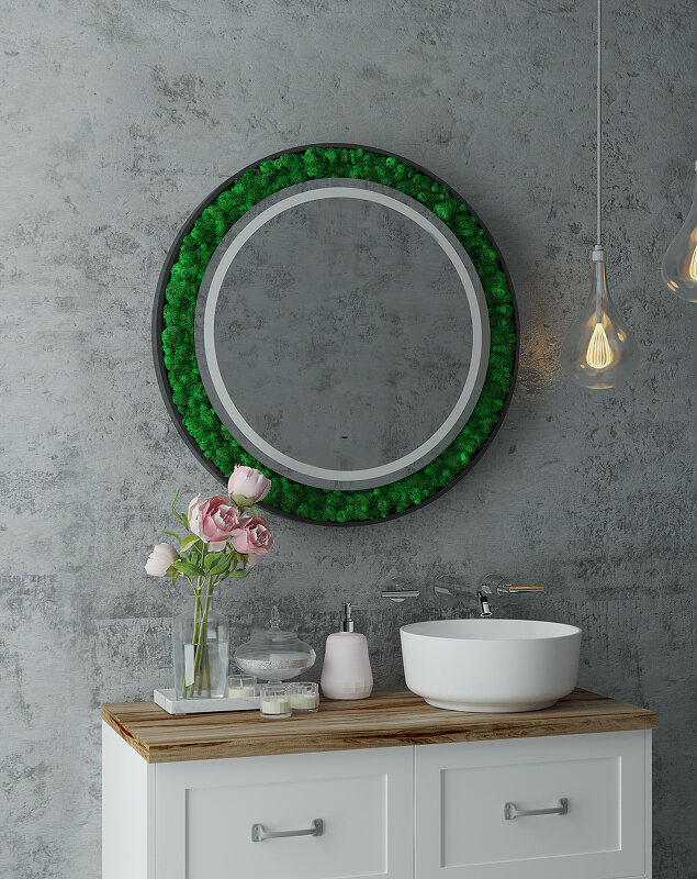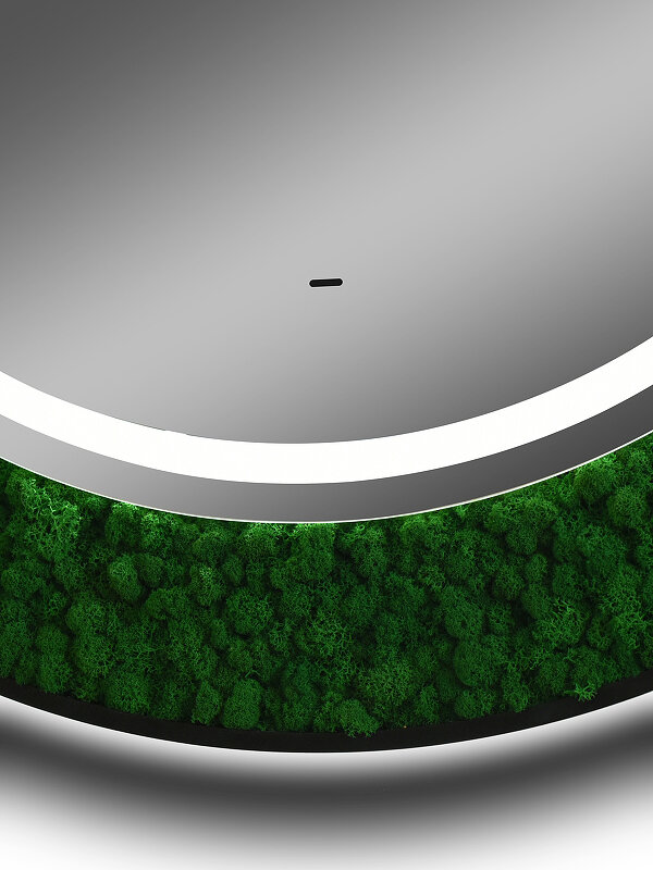 Как ненавязчиво добавить стиля ванной комнате? Наше решение — зеркало «Forest», украшенное стабилизированным мхом. Да-да, это то, что Вы подумали! Мох настоящий ?? Растение не только станет главным элементом комнаты, но также сохранит свой внешний вид на долгие годы, не требуя ухода! Практичное и стильное решение по добавлению уюта Вашему пространству. Что касается самого зеркала — это модель нового поколения, изготовленная из серебряного влагостойкого полотна. Зеркало «Forest» оснащено сенсорным управлением, благодаря которому Вы сможете регулировать яркость подсветки согласно своему комфорту.