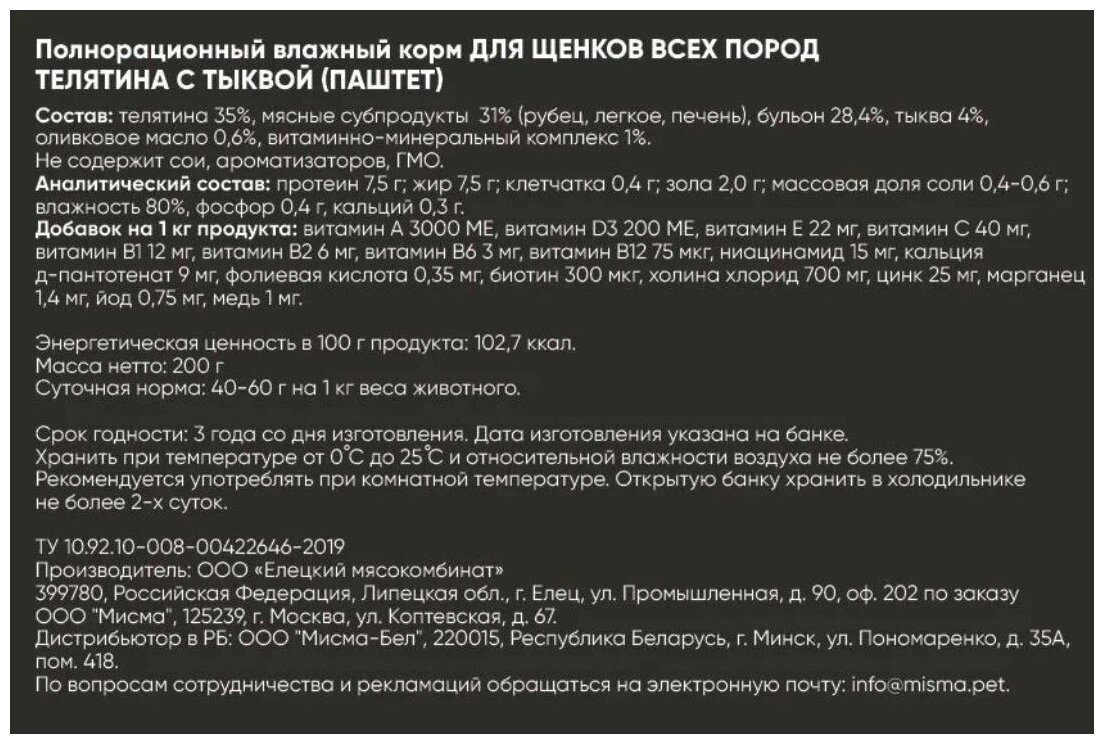 Состав: говядина 35%, мясные субпродукты 31% (рубец, легкое, печень), бульон 28,4%, тыква 4%, оливковое масло 0,6%, витаминно-минеральный комплекс 1%.