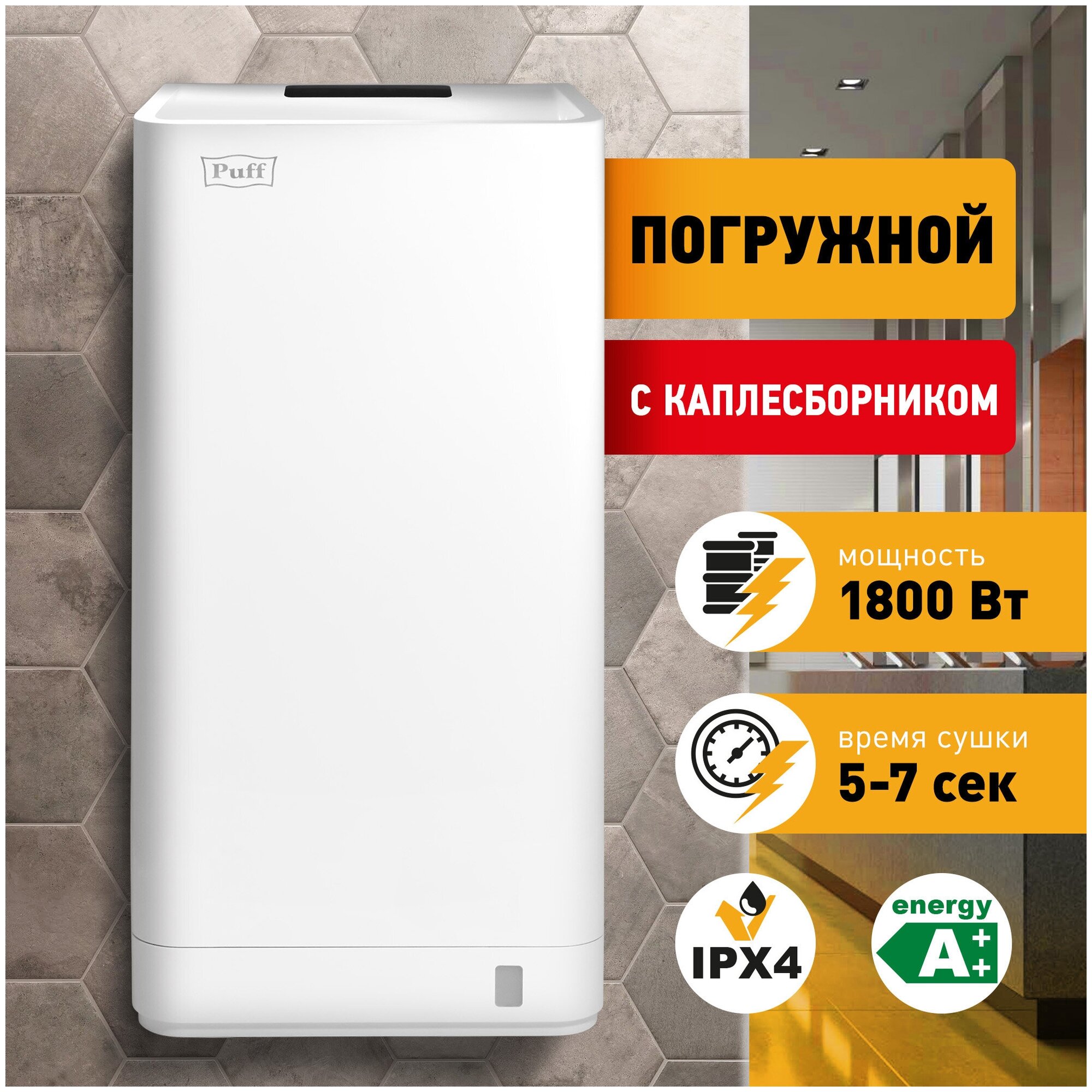 | Прочие особенности и свойства | Электрическая сушилка для рук Puff-8875 относится к классу высокоскоростных электросушилок с вертикальной загрузкой рук во влагоприемник. Осушение рук осуществляется за счет двух узконаправленных быстрых потоков воздуха, которые фактически сдувают воду. Скорость воздуха может достигать 95 м/сек. При использовании такого типа электрополотенца, сушка рук занимает от 5 до 7 секунд., , Данная модель рукосушителя снабжена переключателем холодный-горячий, что дает возможность использовать холодный воздух (при мощности устройства 1200 Вт.) или горячий воздух (при мощности устройства в 1800 Вт.). |