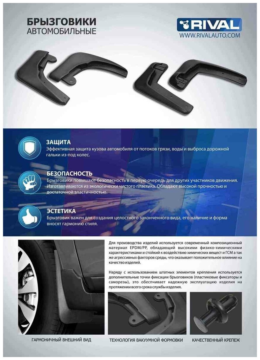 Брызговики Rival защищают покрытие автомобиля от грязи, мусора и посторонних предметов, летящих из-под колес вашего автомобиля во время движения.