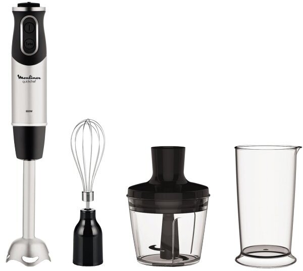 Moulinex DD653 – современный погружной блендер, предназначенный для измельчения и смешивания продуктов. Он работает быстро и эффективно. Блендер оснащён удобной прорезиненной ручкой, которая не скользит в ладони. 20 скоростных режимов. К блендеру прилагаются насадка для измельчения и смешивания, форма которой обеспечивает отсутствие брызг при использовании, а также мини-измельчитель, объём которого составляет 500 мл, и металлический венчик для взбивания.