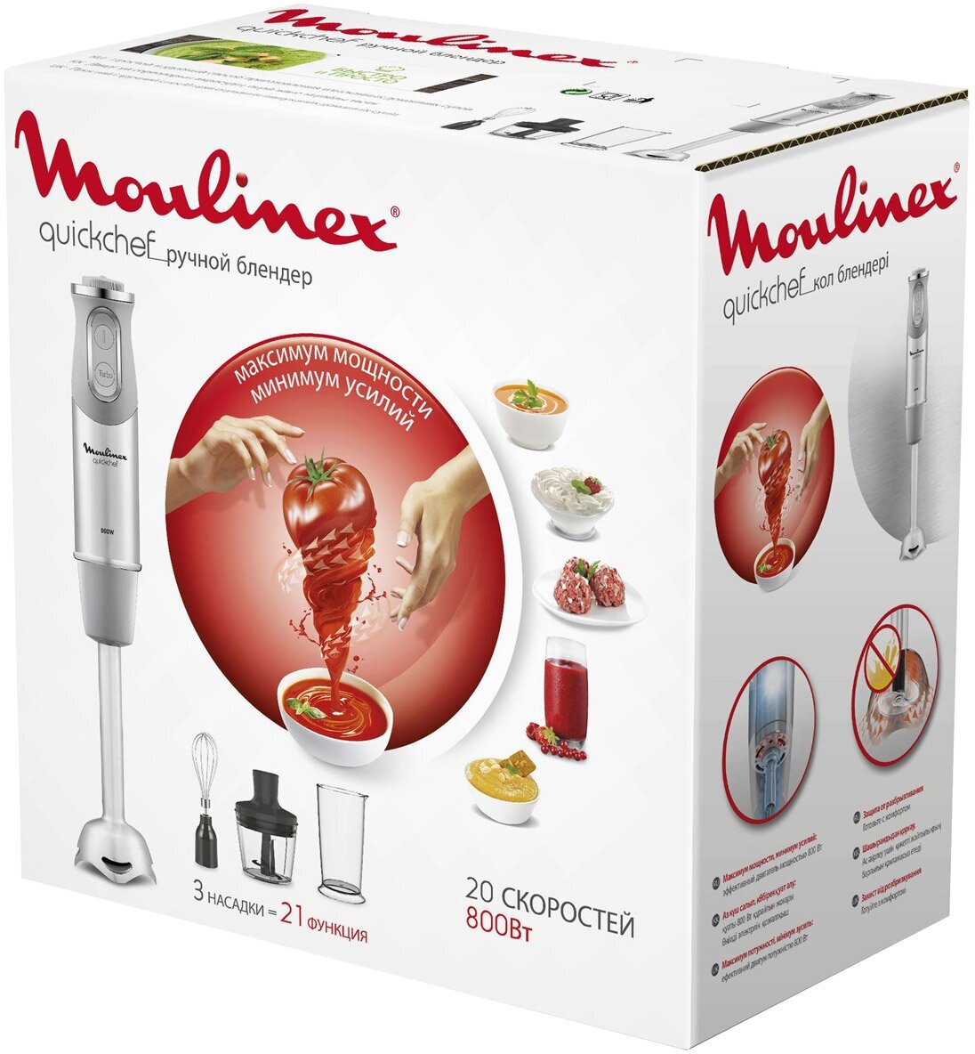 - Мощный мотор - 800 Вт. Удобный переключатель на 20 скоростей. Функция турборежима. Измельчитель, венчик для взбивания и мерный стакан в комплекте.