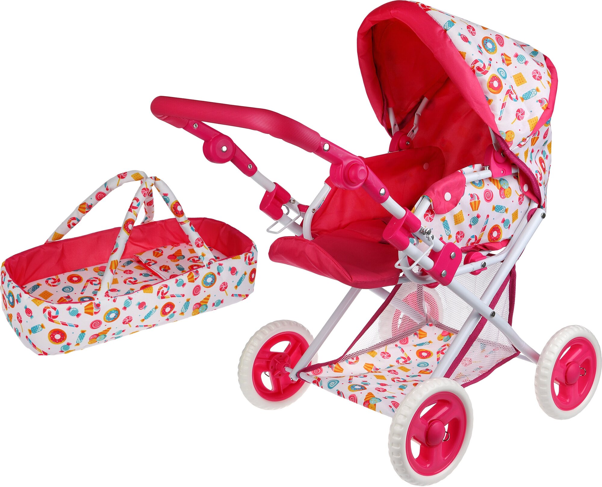 Коляска-трансформер Корона предназначена для сюжетно-ролевой игры в дочки-матери и подойдет для куклы с ростом до 40 см. Люлька-переноска оборудована текстильными ручками, она снимается с основы коляски и в ней можно переносить куклу отдельно. Без люльки коляска превращается в прогулочную, для этого нужно привести спинку в вертикальное положение, после этого куклу можно усадить в коляску, пристегнув ее ремнем безопасности. У коляски регулируется угол наклона ручки, подножка - в прогулочной модификации, положение подголовника и капюшон. На ручке коляски есть мягкая накладка. В текстильный поддон можно положить любимые игрушки. Коляска легко складывается. Снаружи чехол коляски сделан из материала с модным эксклюзивным принтом с забавными персонажами, узорами и цветочными мотивами, внутри чехол однотонный голубой. Размер коляски: 45х38х54 см. Регулируемая ручка, регулируемая подножка, регулируемое положение подголовника, регулируемый капюшон, съемная люлька-переноска.