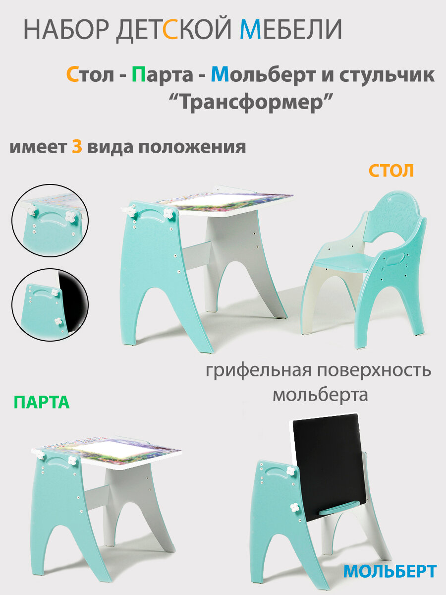 Набор мебели Тех Кидс Зима-Лето гармонично дополнит современный интерьер подрастающего ребенка. Комплект отвечает последним тенденциям времени, диктующего все новые и новые параметры для достижения максимального комфорта. Конструкция парты представляет собой трансформер, который позволит своему маленькому владельцу не испытывать никаких ограничений на занятиях творчеством или при выполнении заданий. Одним движением руки столик превращается в парту или мольберт при помощи поворотного шарнира, а скрепляется специальными барашками. Качественный МДФ тщательно отшлифован во избежание возникновения микротравм владельца и абсолютно безопасен для использования. Удобный стульчик с эргономичной спинкой позволит расслабиться крохе, а познавательная аппликация на столешнице позволит в наглядной и красочной форме познакомиться с алфавитом и цифрами.