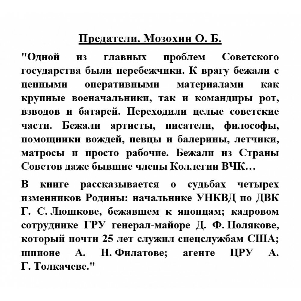 В книге рассказывается о судьбах четырех изменников Родины: начальнике УНКВД по ДВК Г.С. Люшкове, бежавшем к японцам; кадровом сотруднике ГРУ генерал-майоре Д.Ф. Полякове, который почти 25 лет служил спецслужбам США; шпионе А.Н. Филатове; агенте ЦРУ А.Г. Толкачеве.
