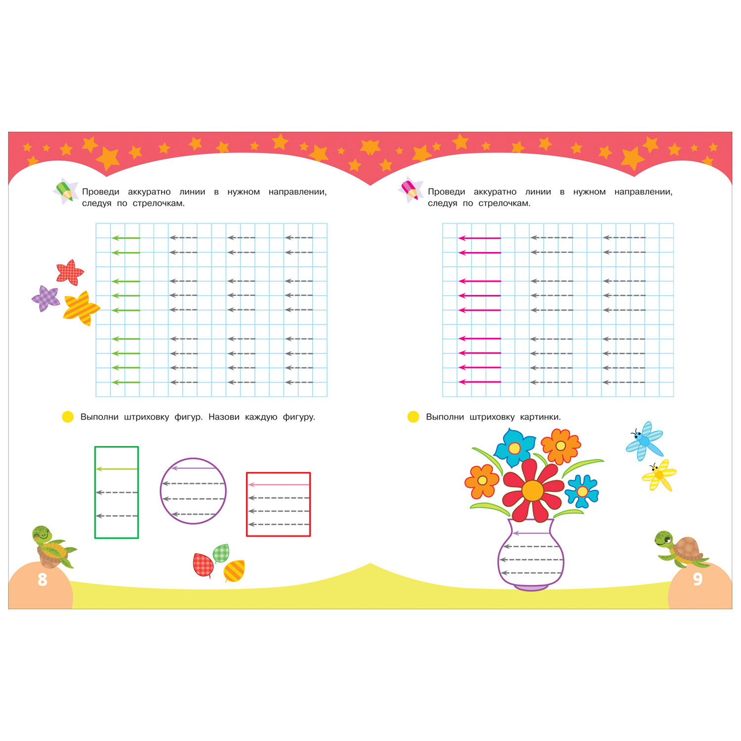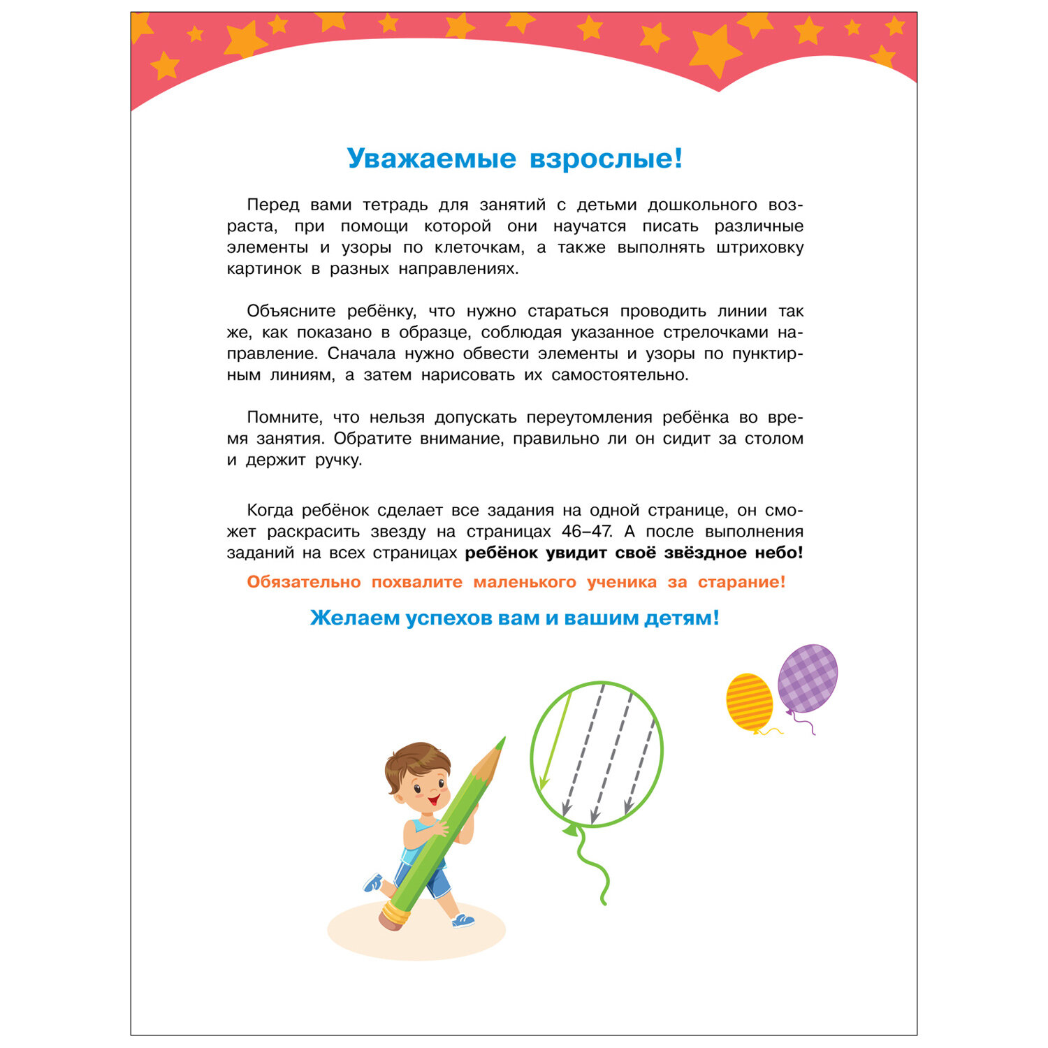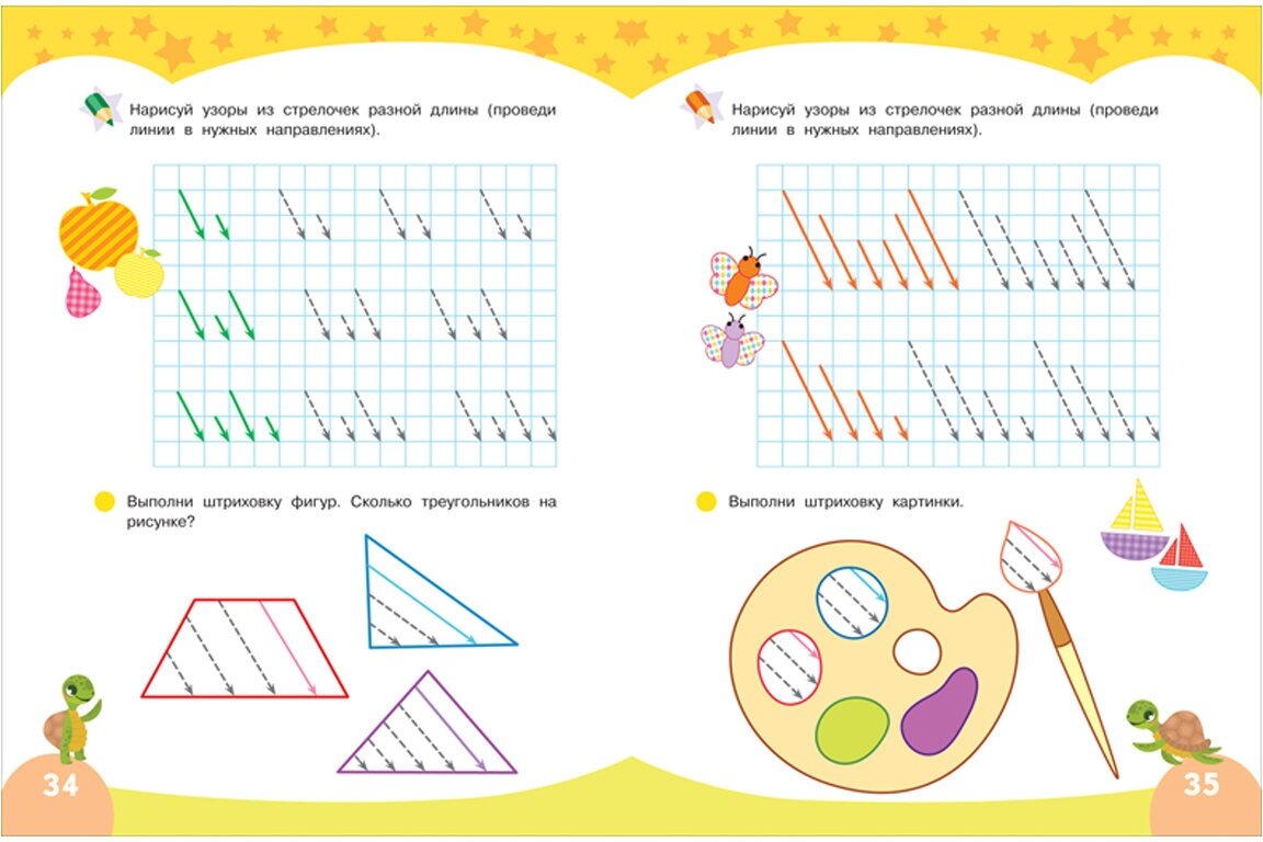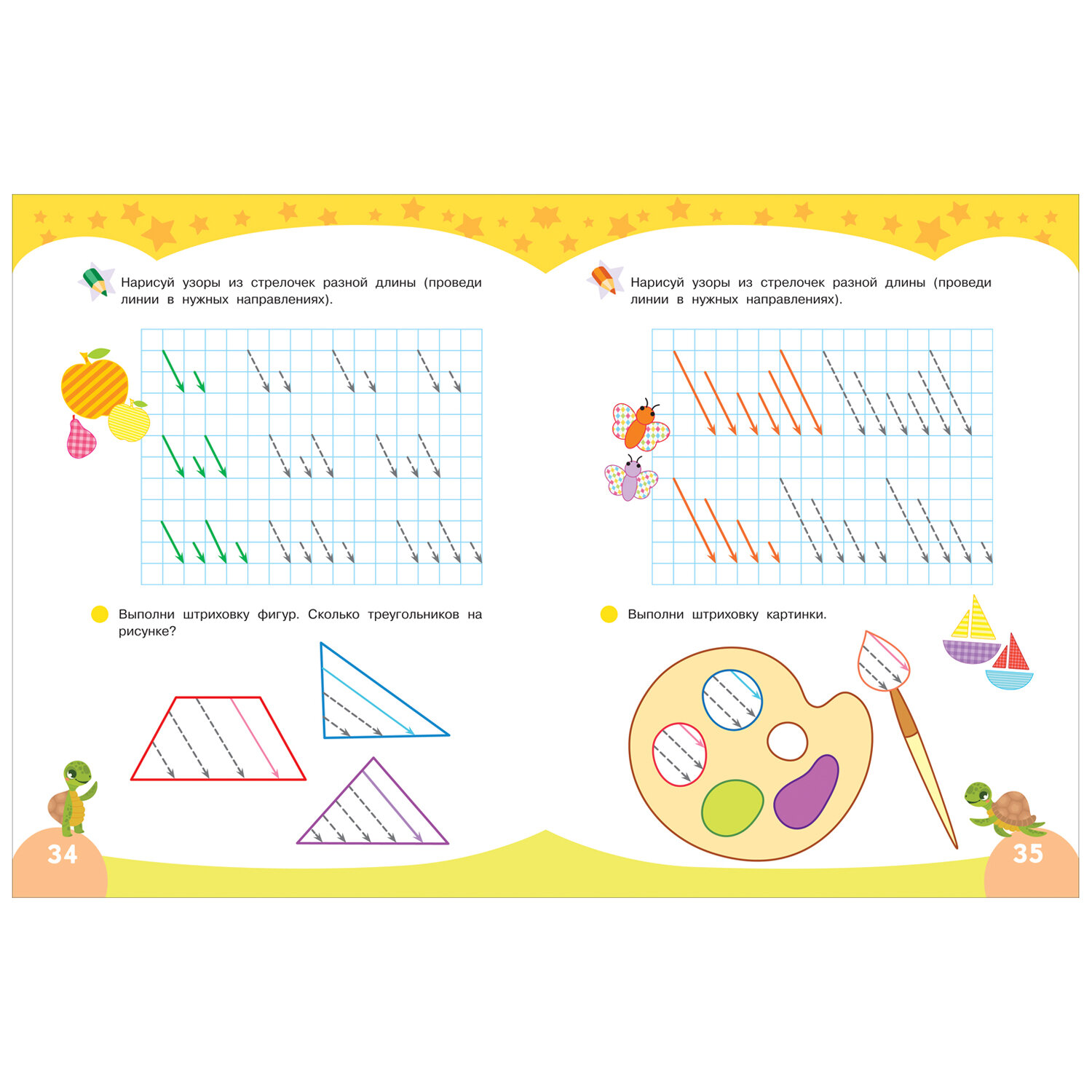рисовать УЗОРЫ, ВЫПОЛНЯТЬ ШТРИХОВКУ фигур и картинок и подготовить руку к письму. Ребёнок будет чертить прямые и круговые линии в разных направлениях, обводить и рисовать фигуры и картинки, не отрывая руки от листа.