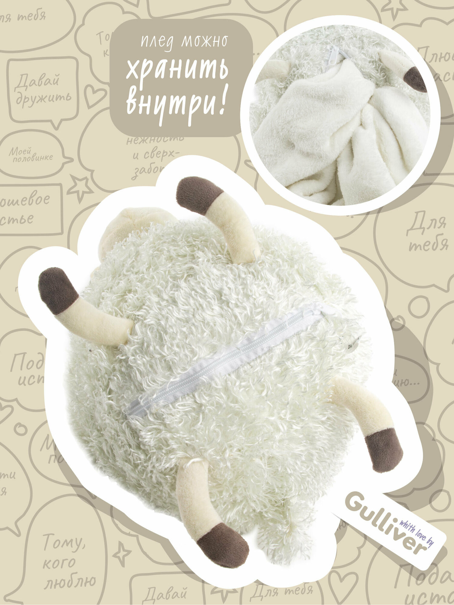 Круглая мягкая игрушка "Овечка Кудряшка" Gulliver - это и мягкая игрушка, и подушка с пледом внутри. Невероятно мягкий мех, используемый для изготовления данной модели, очень приятен на ощупь, на нем приятно прильнуть и укрыться мягким пледом. Размер пледа - 130x180 см. Плед помещается внутри игрушки, под замком-молнией. Игрушка и плед изготовлены в одинаковых оттенках и благодаря своей окраске впишутся практически в любой интерьер. Мордочка игрушки деталилизирована, глазки и другие мелкие детали вышиты. Такая игрушка с пледом станут прекрасным подарком и взрослому и ребенку к любому празднику.