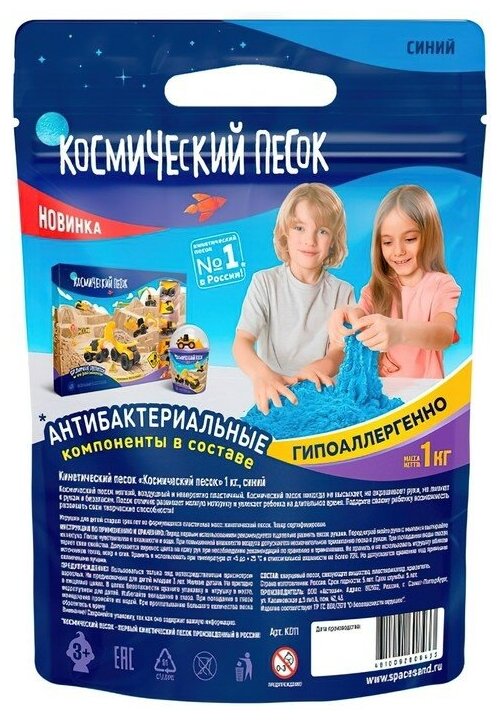 Космический песок мягкий, воздушный и невероятно пластичный. Космический песок никогда не высыхает, не окрашивает руки, не липнет к рукам и абсолютно безопасен. Песок отлично развивает мелкую моторику и увлекает ребенка на длительное время. Подарите своему ребенку возможность развивать свои творческие способности! *Космический песок - первый кинетический песок произведенный в России!