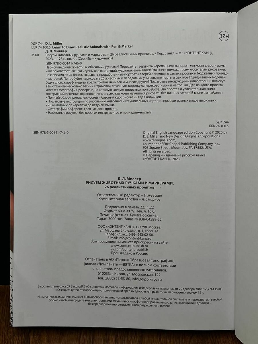 Рисуем животных ручками и маркерами 26 реалистичных проектов (Миллер Д.Л.); Контэнт, 2023