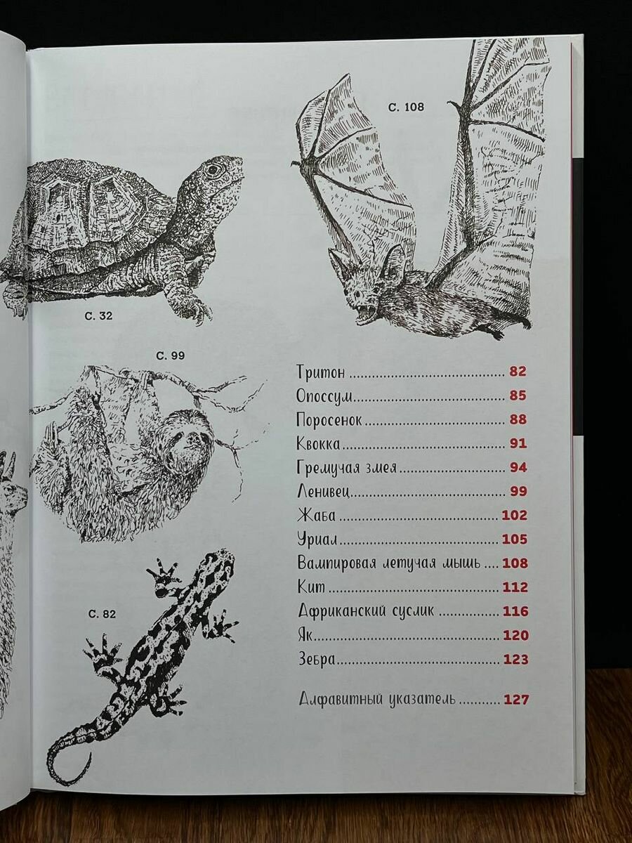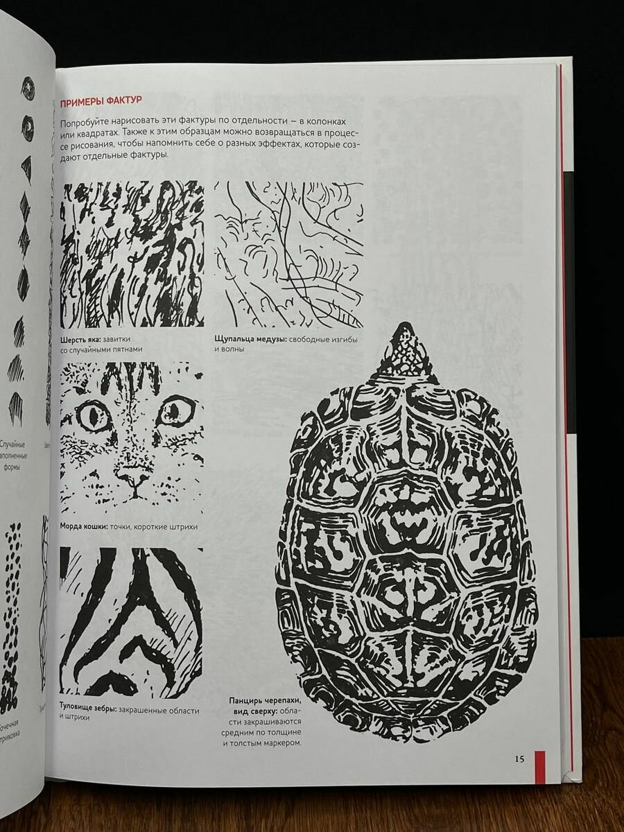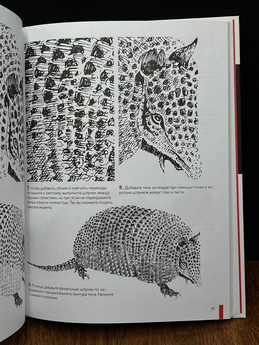Прекрасное издание для всех, кто любит рисовать живых существ, от ёжика до жирафа и от медузы до кита. В книге автор показывает слегка монотонный, но эффективный и простой процесс рисования. \"Пусть вам будет интересно слой за слоем переносить на бумагу саму суть каждого животного\". Начинать рисовать можно обыкновенной ручкой, а усовершенствовать свои навыки с помощью пера и туши.