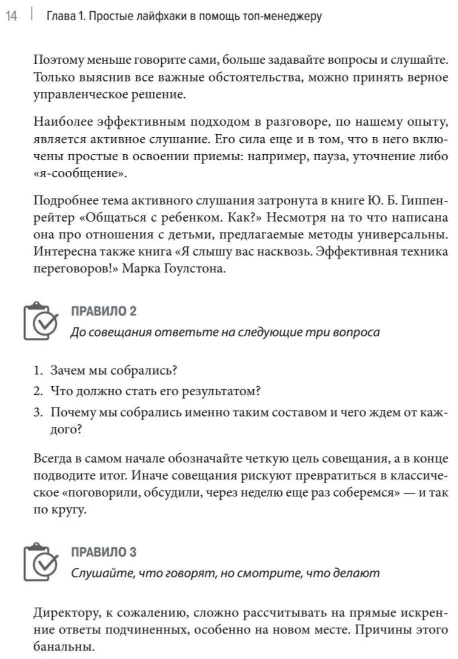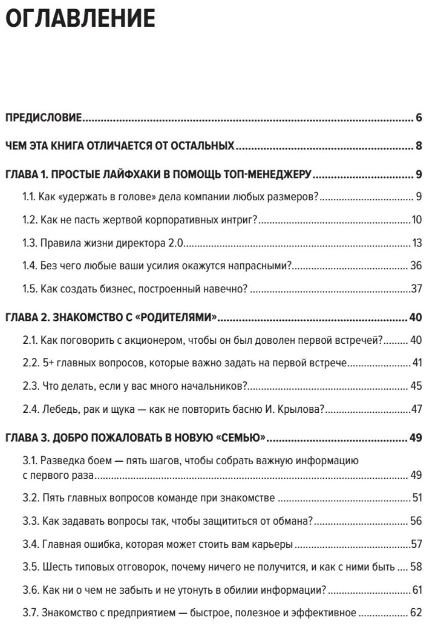 Книга то в целом не плохая, но немного не понятно, как человек дослужившийся до директора или топ-менеджера не знает всех тонкостей и подводных камней своей должности. Я бы сказала, что эта книга для начинающих и только мечтающих, занять такие руководящие места, людей. Советов много, сразу все и не упомнить) Старайтесь читать вдумчиво, чтоб был толк от прочитанного, ну и мой совет: не следовать слепо всему, что написано, всё таки думать надо своей головой, а не чужой!