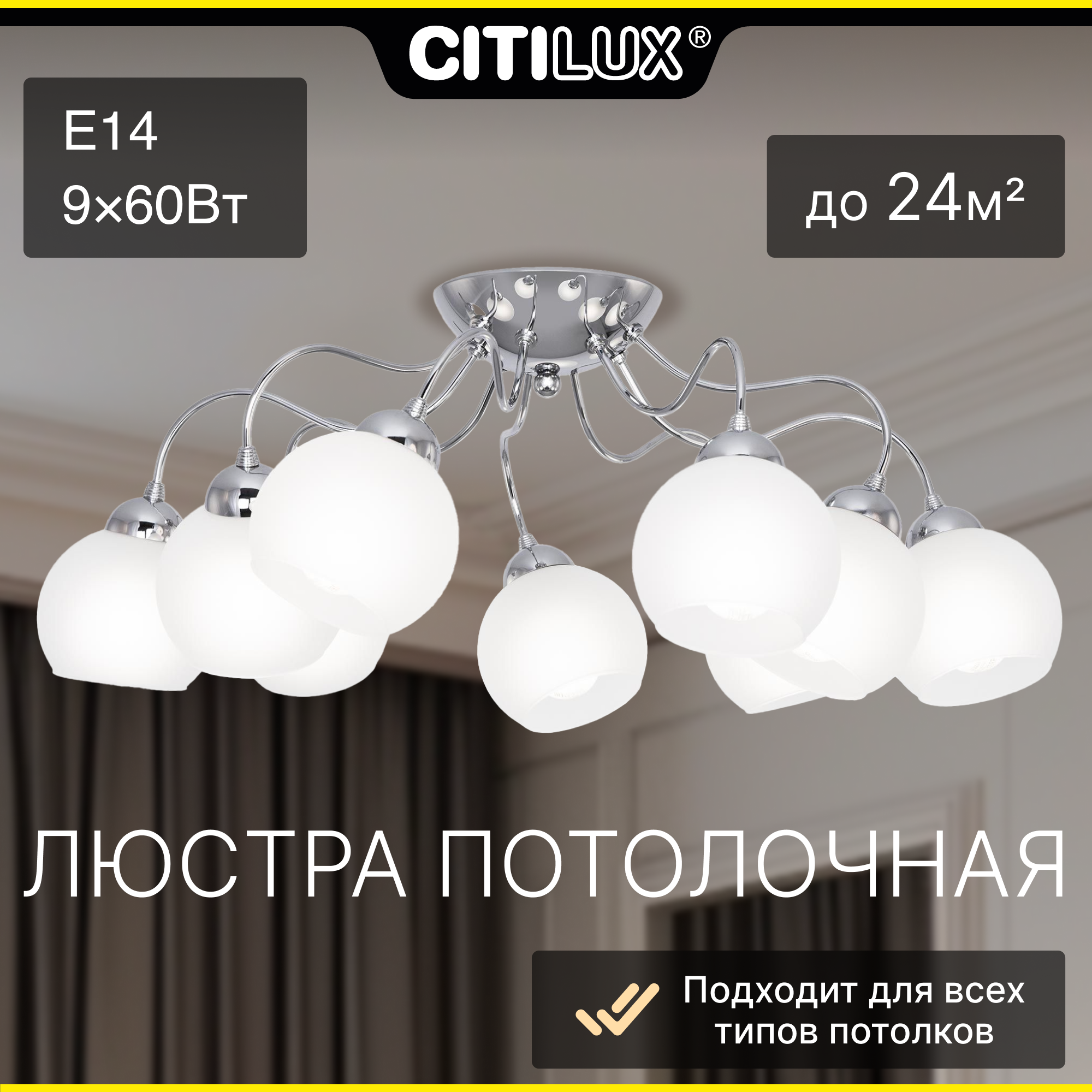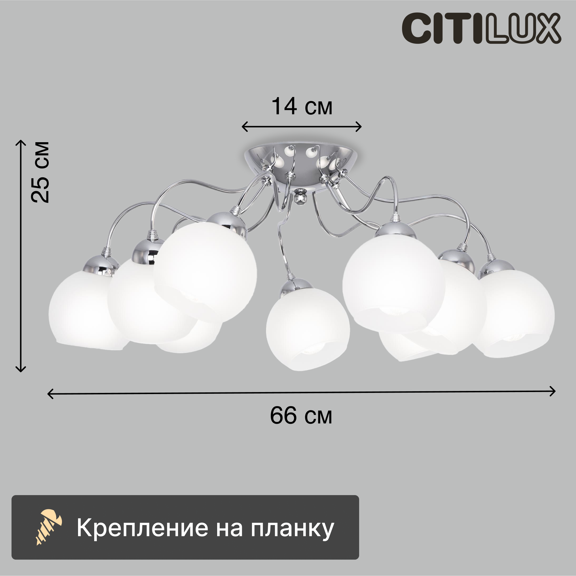 Потолочная люстра Citilux Лучиана CL147191 в современном стиле. Корпус металлический, с изящно изогнутыми рожками, цвет хром. Плафоны стеклянные, полуматовые, в форме усеченного шара. В изделии используются 9 ламп с цоколем Е14, максимальной мощностью для ламп накаливания 60Вт. Светодиодные лампы можно устанавливать более яркие. Светильник рассчитан на работу как с одноклавишным, так и с двухклавишным выключателем. Подходит для всех типов потолков, в том числе натяжных, тип крепления – планка. Поставляется в компактной упаковке, в частично разобранном виде