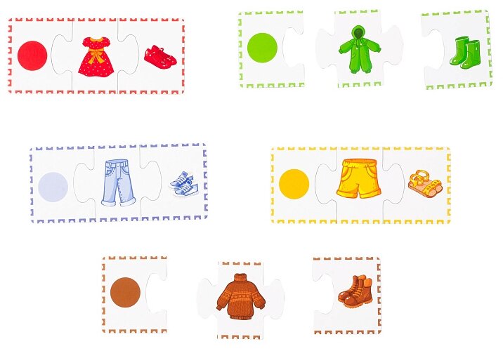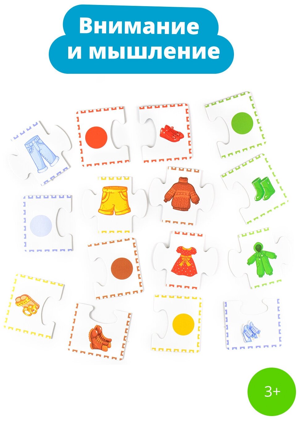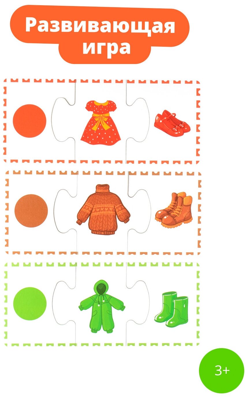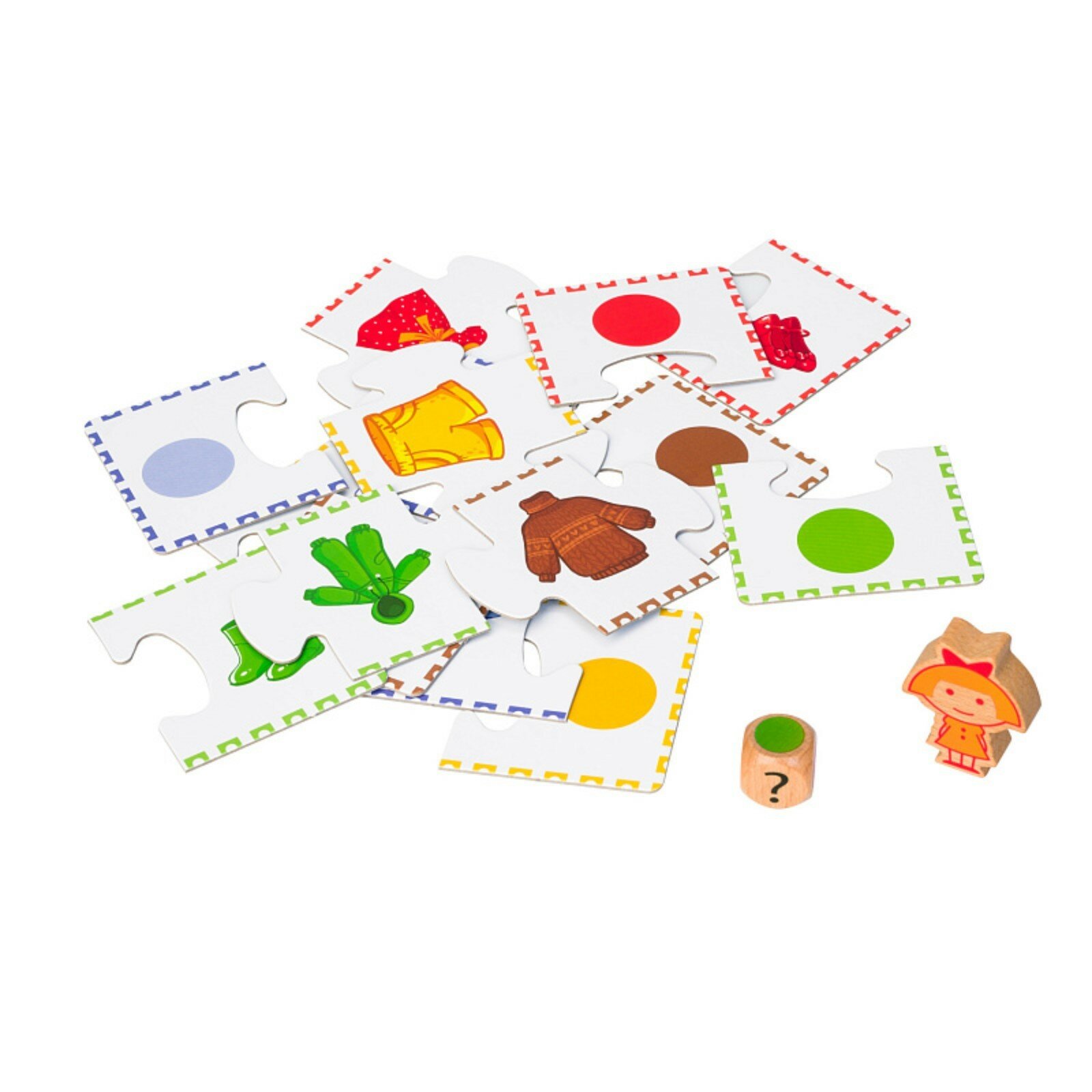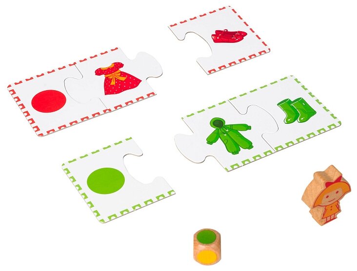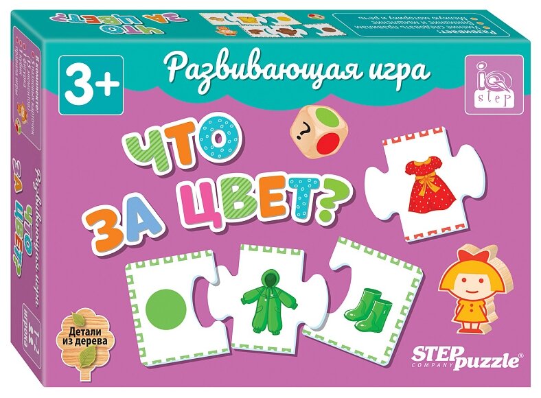 Познавательная игра «Что за цвет?» создана для развития детей с 3 лет.Играя в нее, малышу предстоит собирать из последовательных элементов «тройки». Игра обучает следованию правилам, тренирует логическое мышление, внимание и мелкую моторику.Малыш познакомится с основными цветами, а ещё он усвоит названия различной одежды, научится находить и объединять предметы по смыслу и цвету.В наборе:Пазловые карточки – 5 шт;игральный кубик – 1 шт;деревянная фишка – 1 шт;правила игры – 1 шт.Цель игры: правильно собрать карточку из 3х пазлов.Подходит для детей от 3-х лет.