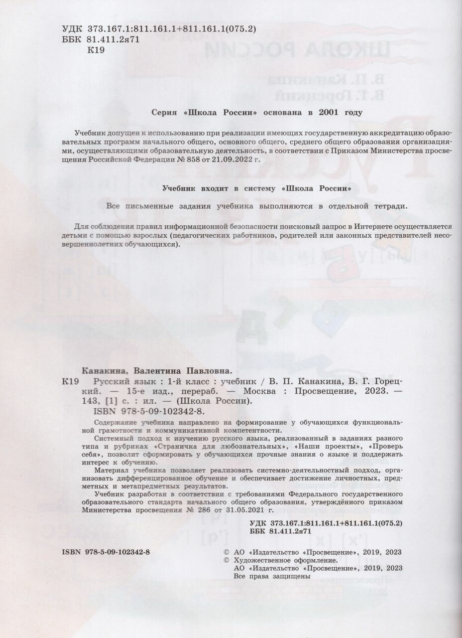 Модель: Школа России. Канакина В.П. Русский язык. 1 класс. 2023