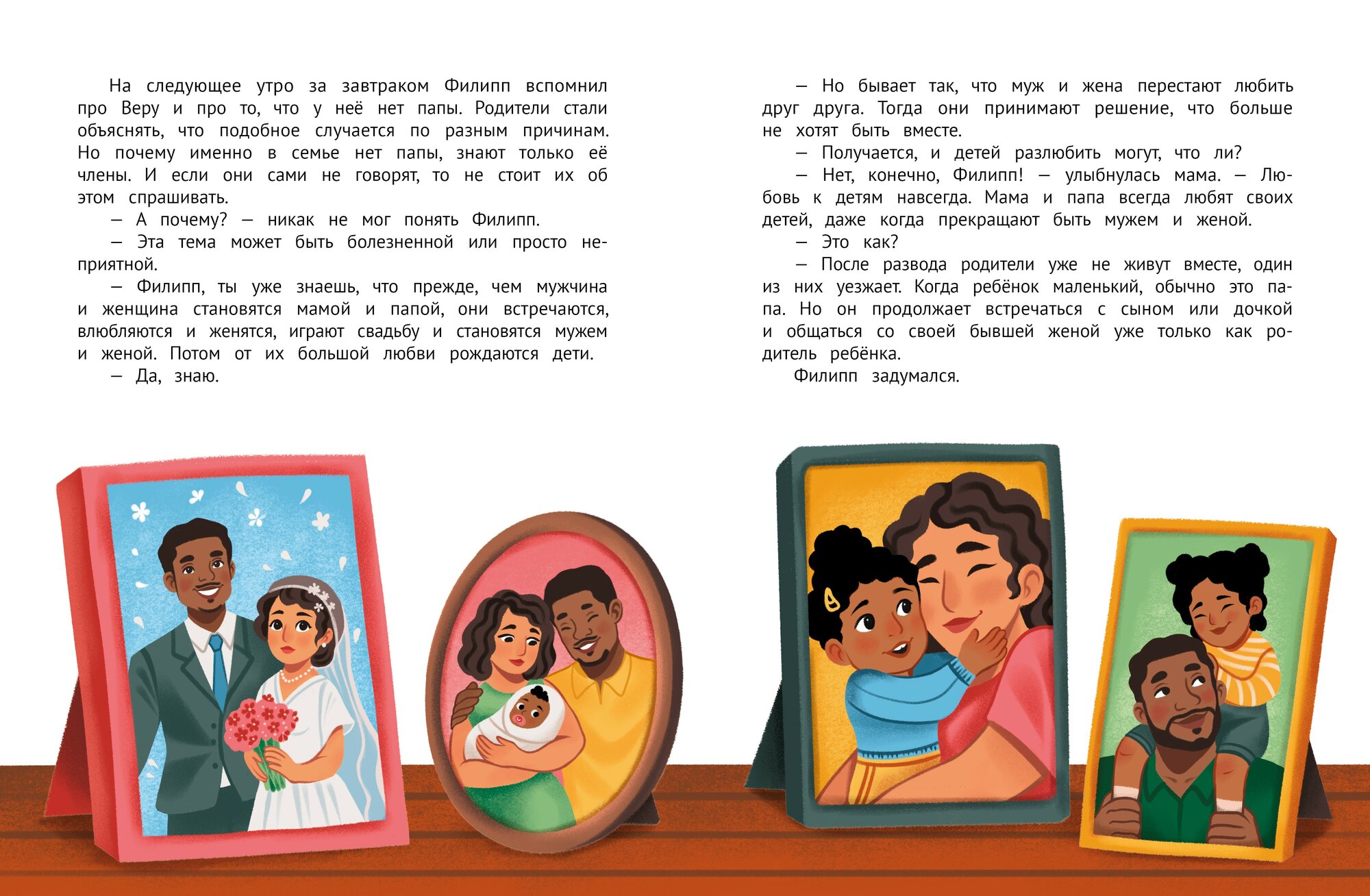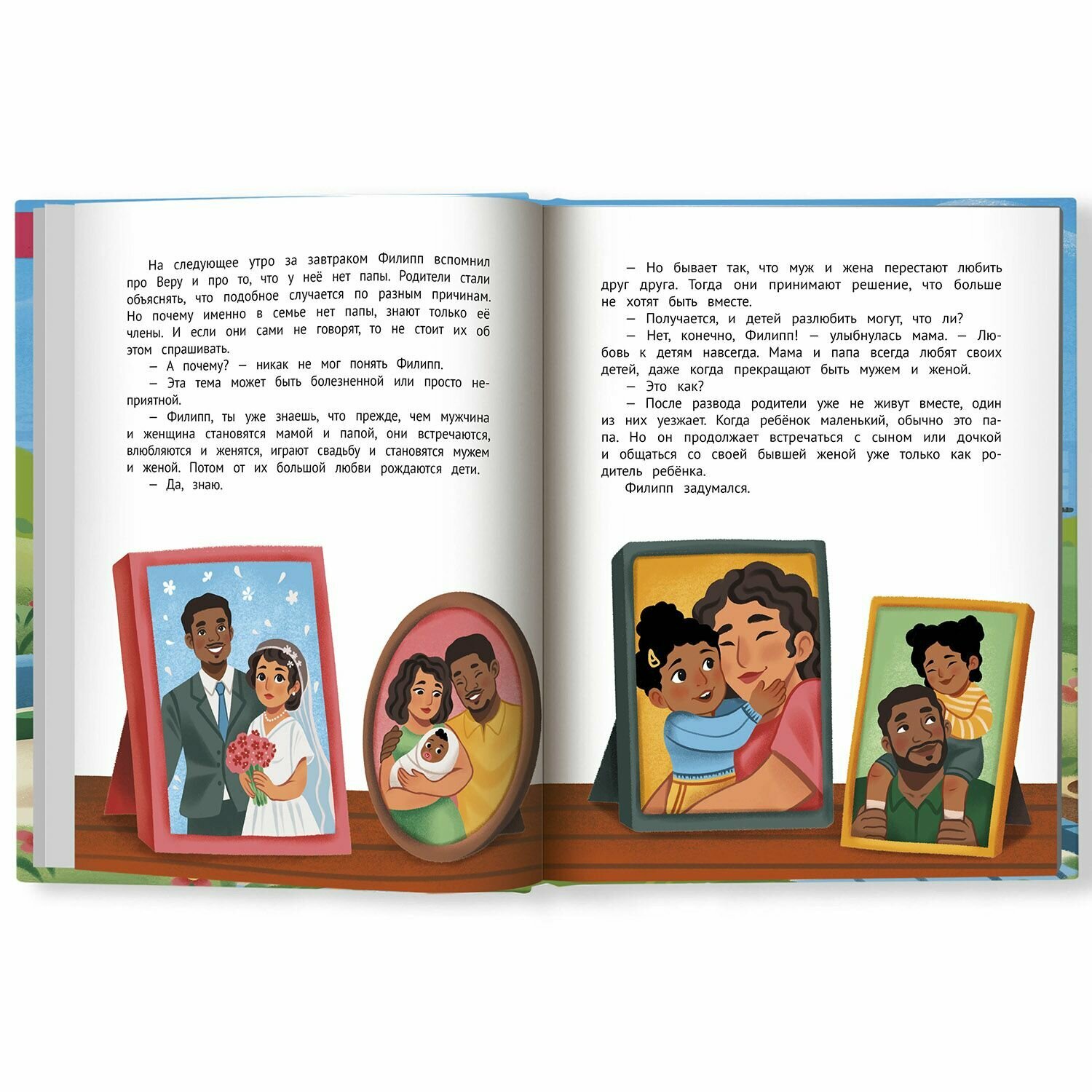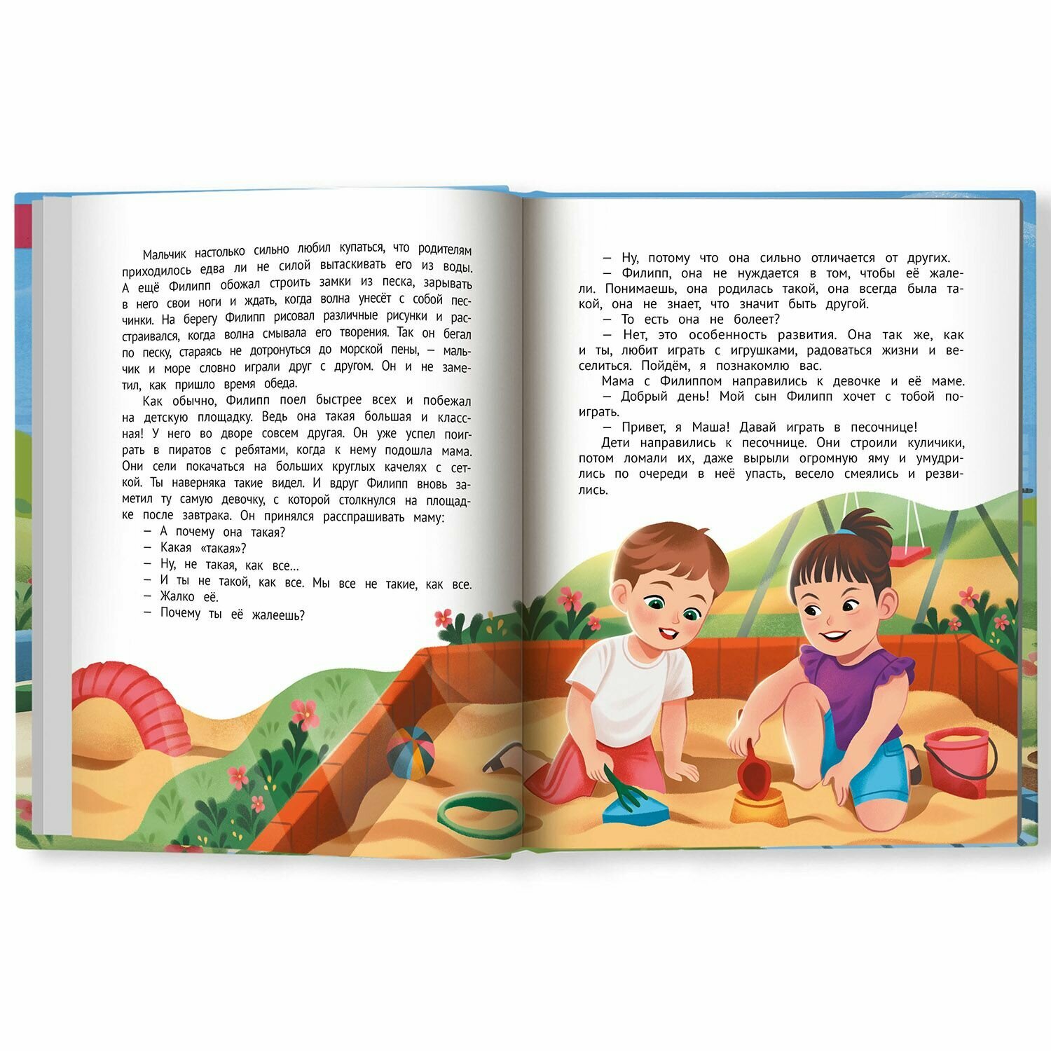 Детский психолог и арт-терапевт Елена Бурьевая придумала истории о мальчике Филиппе, который вместе с родителями узнаёт много нового о мире: он знакомится с детьми, которые выглядят и ведут себя иначе, у которых могут быть другие финансовые возможности или которые живут в семье с одним родителем. Филипп убеждается, что отличия не помеха общению и играм.