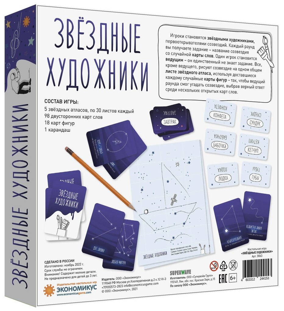 | Комплектация | 18 карт фигур; 98 двусторонних карт слов; 5 звёздных атласов по 30 листов; 1 карандаш |