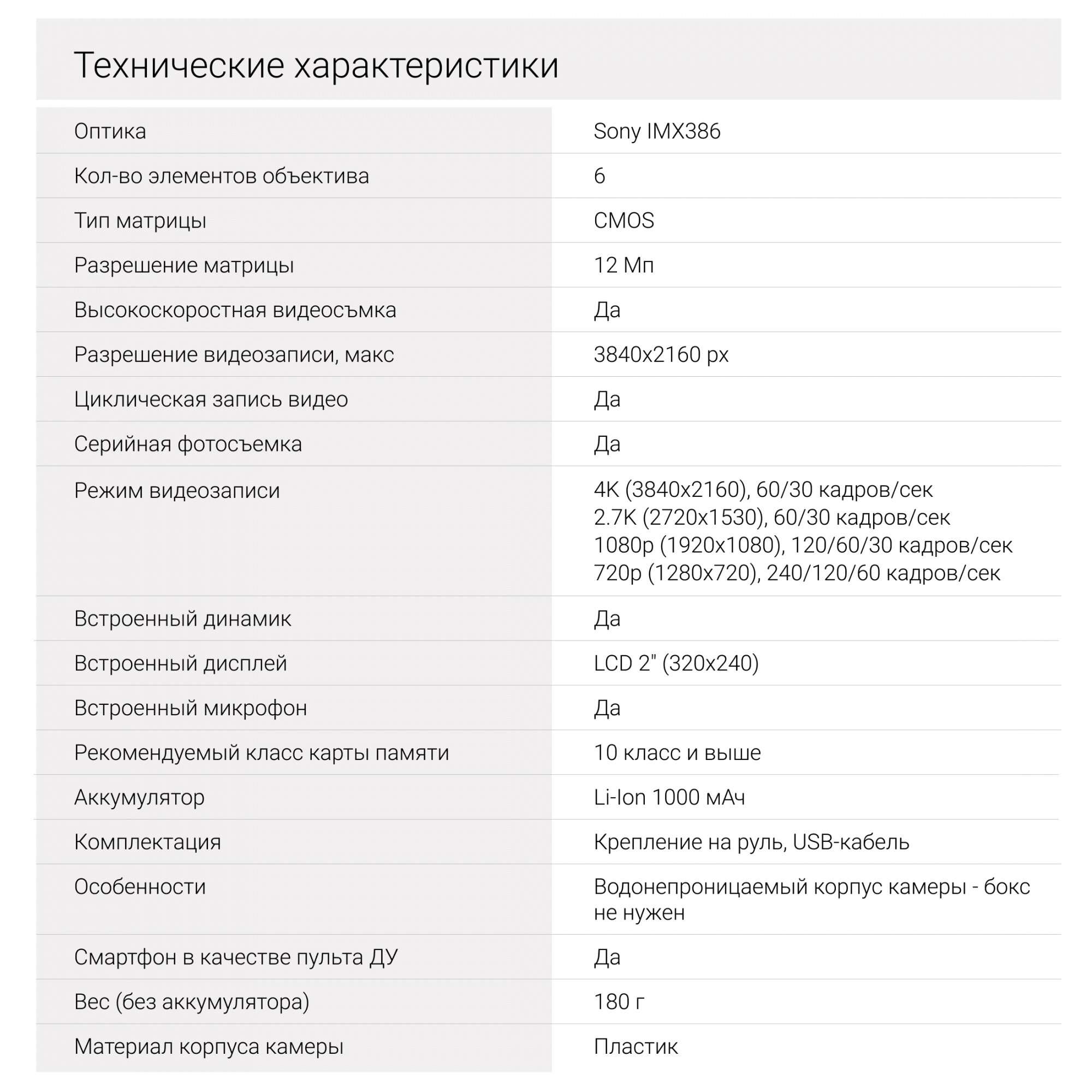Благодаря строгому черному цвету и минималистичному дизайну камера выглядит как стильный аксессуар. Камера выполнена из долговечного, прочного пластика для съемки в экстремальных условиях. Корпус камеры водонепроницаем: проводите съемку под водой без дополнительного водонепроницаемого бокса. Электронная стабилизация изображения позволяет получить видео без эффекта «тряски». Катайтесь на велосипеде и самокате и не думайте о качестве снятого видеоролика.