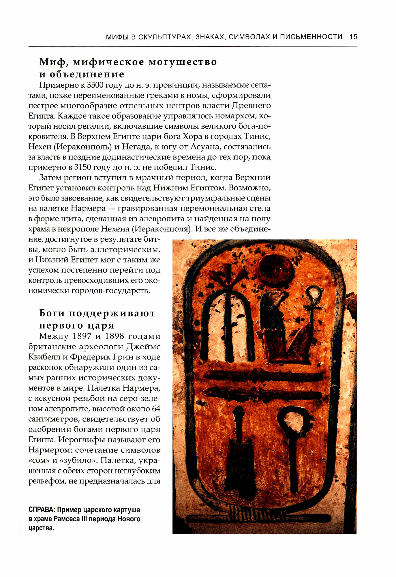 Большой сфинкс в Гизе, загадочные фрески в погребальных камерах пирамид и символические изображения ока Хора - хорошо известные и впечатляющие произведения искусства. Однако они являются лишь отдельными элементами всеобъемлющей космологической системы, в которой происхождение Земли и благоденствие, обеспечиваемое регулярным разливом Нила, объясняются через божественное начало. Со сменой фараонов, подъемом и падением царств и династий роли богов, богинь и их истории изменялись, и таким образом мифология Древнего Египта отражала смену власти, успехи страны и влияние легендарного на жизнь египтян. Настоящее издание дает широкое представление о космологии Древнего Египта, описывая особенности бытования мифов как в среде богатых и облеченных властью людей, так и среди простолюдинов, а также внутреннее и внешнее политическое и экономическое влияние на статус богов и связанные с ними предания и сказания. Кэтрин Чемберс также рассматривает иконографию и тексты, которые переносили египтян от историй, объяснявших окружающий мир, к тайнам и магии царства мертвых, объясняет роли жрецов и исключительность храмов, показывает влияние египетских мифов на систему верований и искусство. Книга "Египетские мифы. Боги и фараоны, сотворение мира и загробная жизнь", иллюстрированная репродукциями произведений искусства и фотографиями, - занимательное и весьма информативное исследование богатой древней культуры, которая очаровывает нас до сих пор.