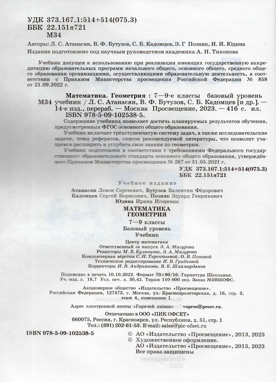 Математика. Геометрия. 7-9 классы. Учебник. Базовый уровень (Сергей Борисович Кадомцев, Левон Сергеевич Атанасян, Валентин Федорович Бутузов); Просвещение, 2025