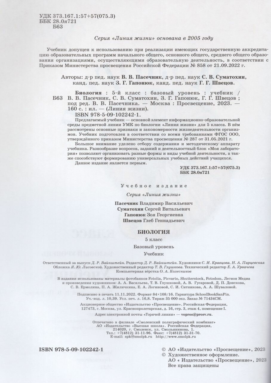 Биология. 5 класс. Учебник. Базовый уровень. ФГОС (Пасечник Владимир Васильевич; Суматохин Сергей Витальевич; Гапонюк Зоя Георгиевна; Швецов Глеб Геннадьевич); Просвещение, 2023