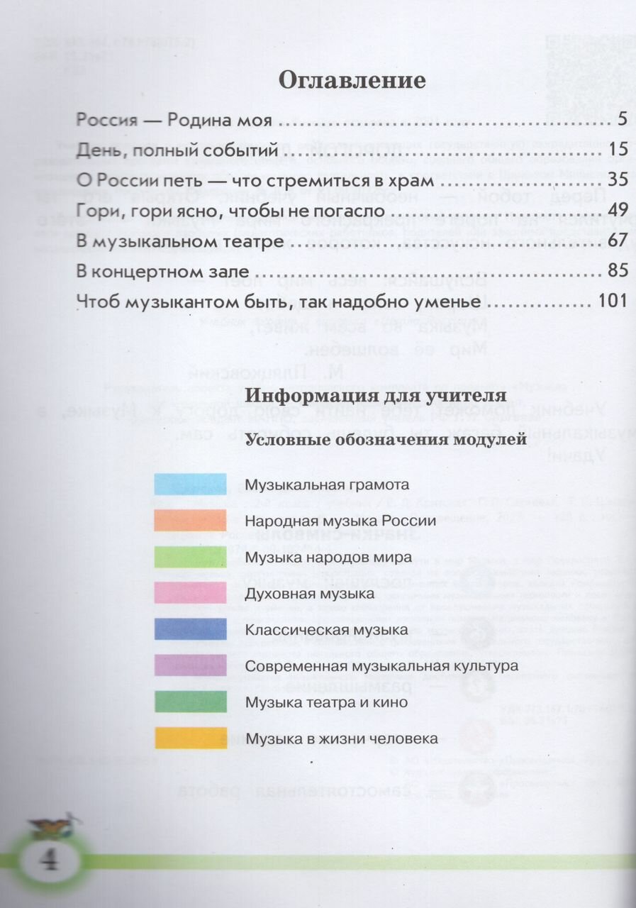 Учебник соответствует ФГОС 2021 г. Этот учебник - следующая ступенька на пути в мир Музыки, в мир Прекрасного. Слушая музыку, рассматривая иллюстрации, отвечая на вопросы, выполняя задания, учащиеся продолжат знакомство с произведениями современных композиторов, великих композиторов прошлого, народной и духовной музыкой, основными музыкальными терминами и понятиями.
