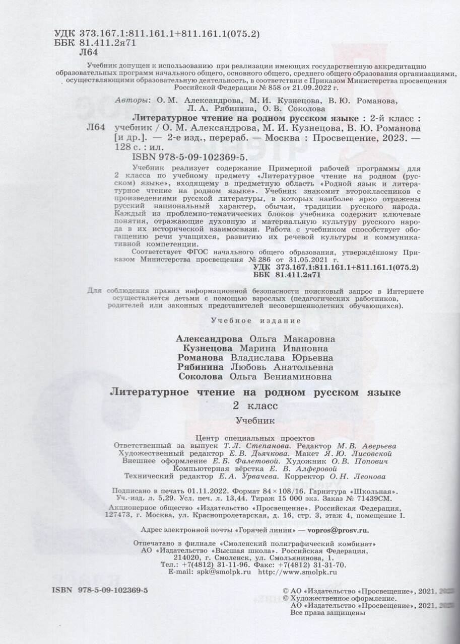 Литературное чтение на родном русском. 2 класс. Учебник (Александрова Ольга Макаровна; Кузнецова Марина Ивановна; Романова Владислава Юрьевна; Рябинина Любовь Анатольевна; Соколова О.В.); Просвещение, 2023