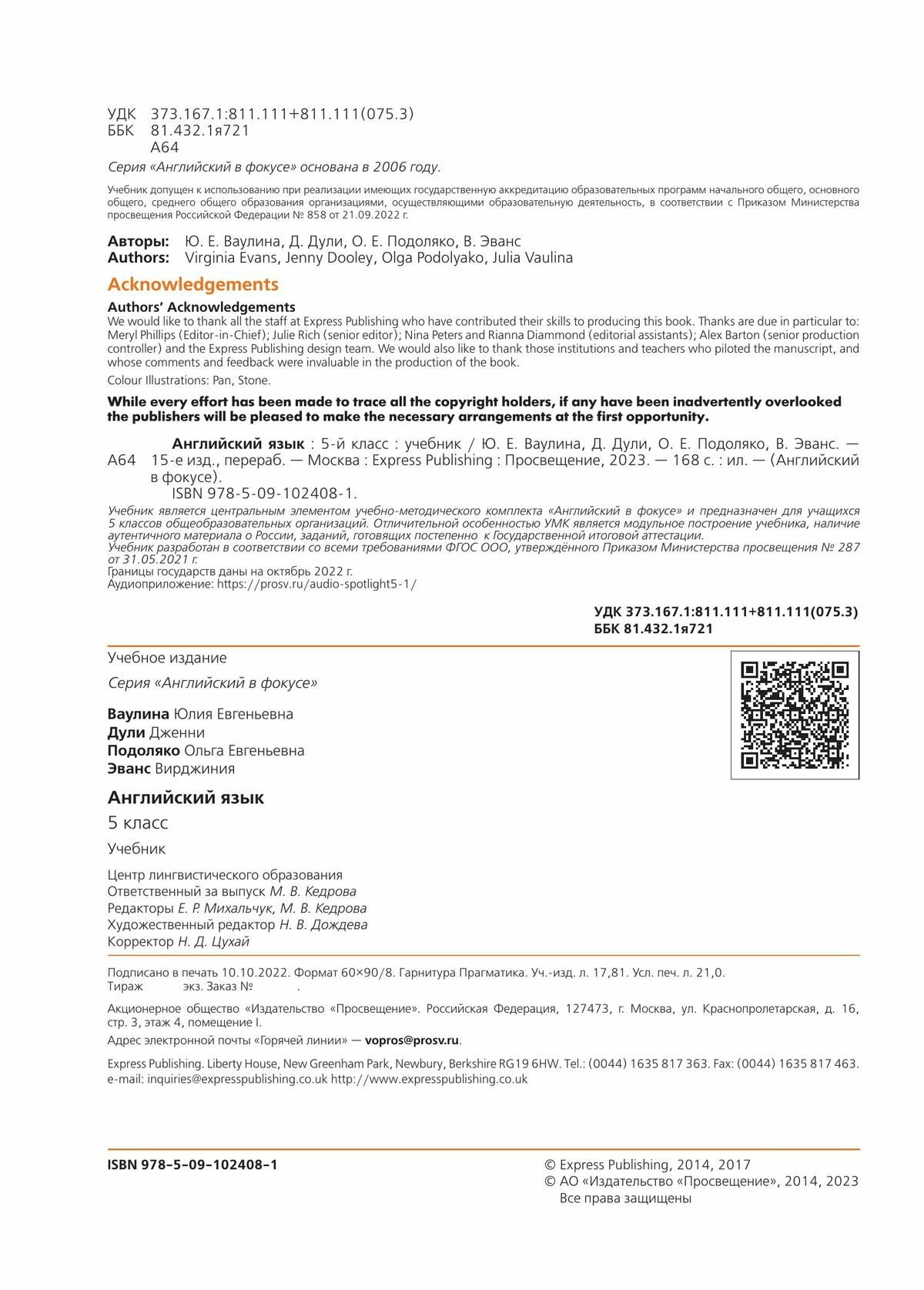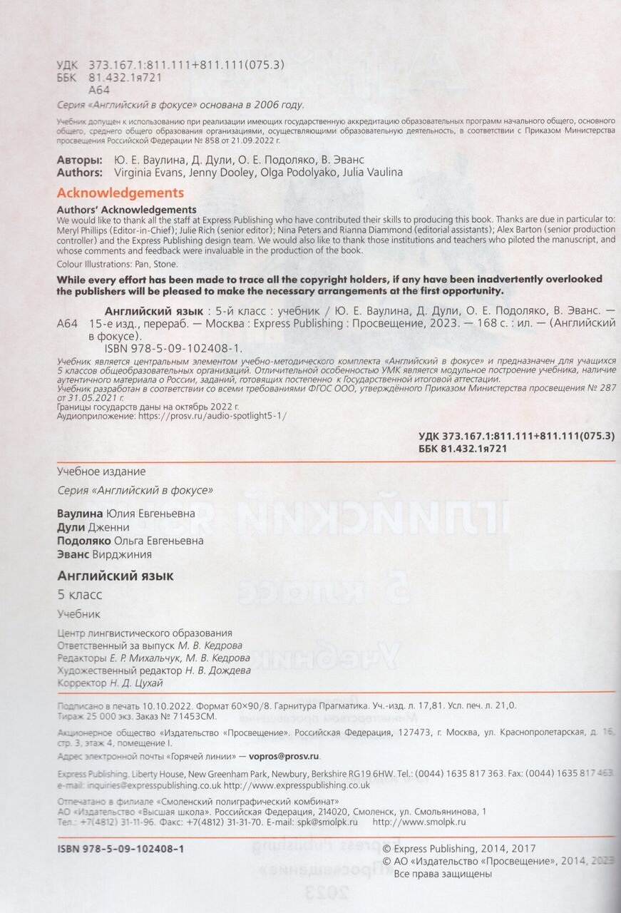 Английский язык. 5 класс. Учебник. ФГОС (Ваулина Юлия Евгеньевна, Дули Дженни, Подоляко Ольга Евгеньевна); Просвещение, 2023