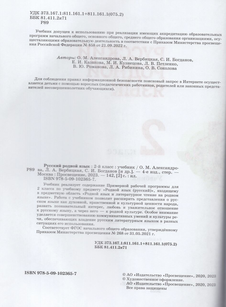 Русский родной язык. 2 класс. Учебник (Людмила Алексеевна Вербицкая, Ольга Макаровна Александрова, Сергей Игоревич Богданов); Просвещение, 2025