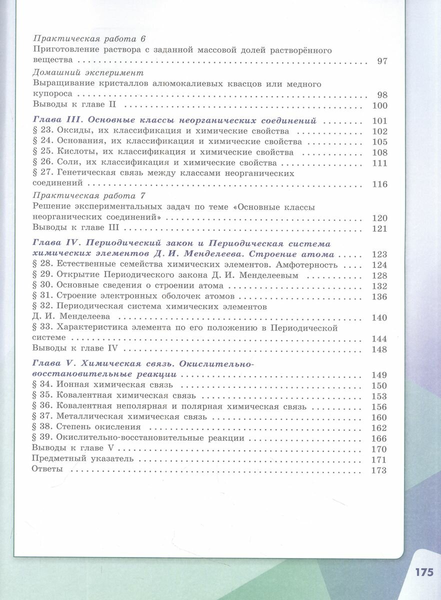 Материал учебника ориентирован на освоение учащимися первых научных понятий о неорганических веществах, их свойствах и превращениях, методах получения и практическом применении и основан на достижениях химии как области современного естествознания. Усвоению материала способствуют практическая направленность, схемы и иллюстрации, составляющие неотъемлемую часть авторской методики. Большое внимание в учебнике уделено развитию универсальных учебных действий, формированию экспериментальных умений и навыков.
