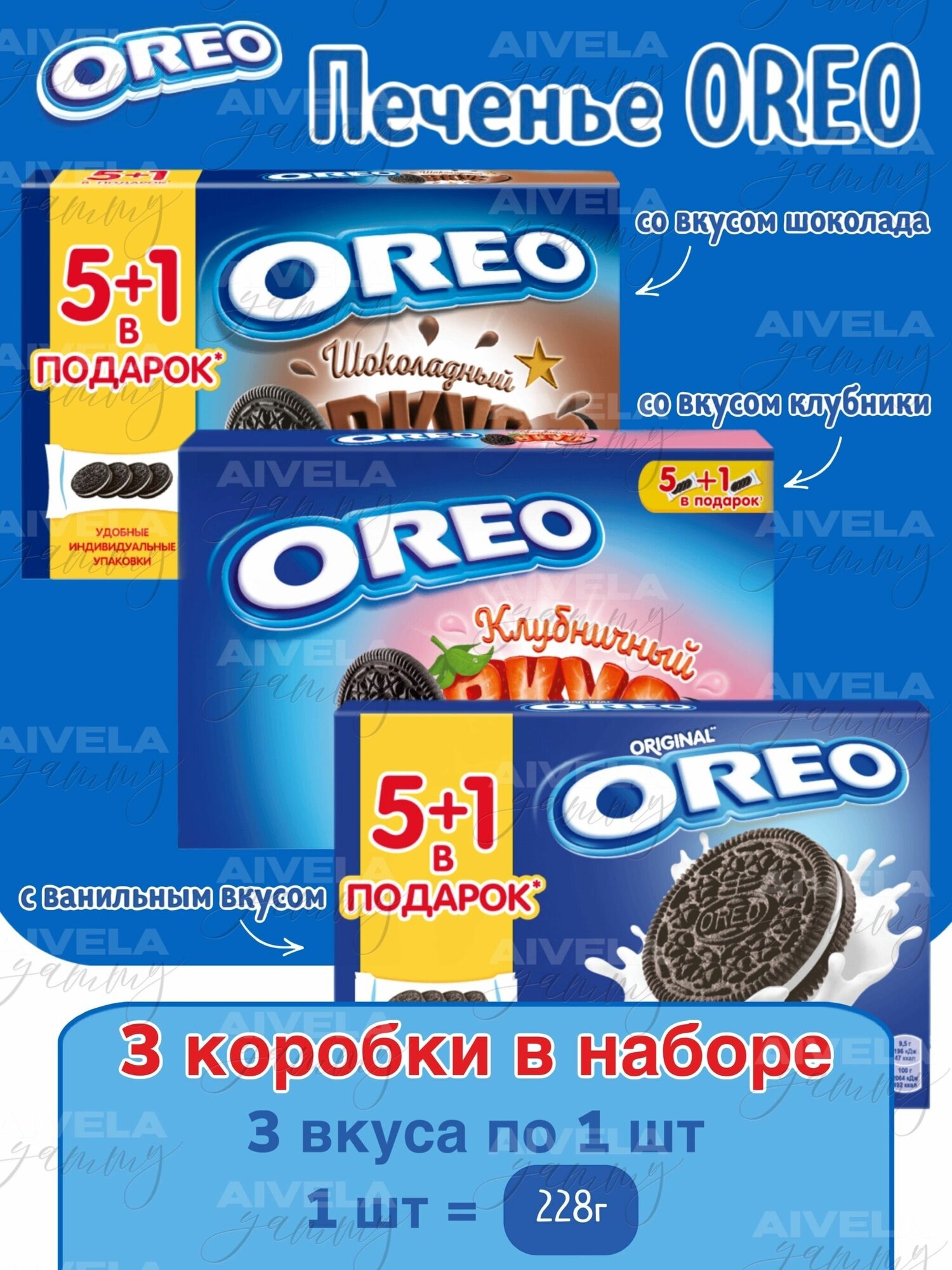 Печенье Орео с какао ассорти начинок шоколад ваниль и клубника в коробке/ Oreo 228г х 3шт набор печенья в индивидуальных упаковках