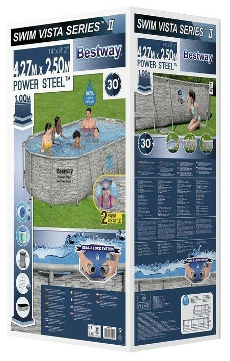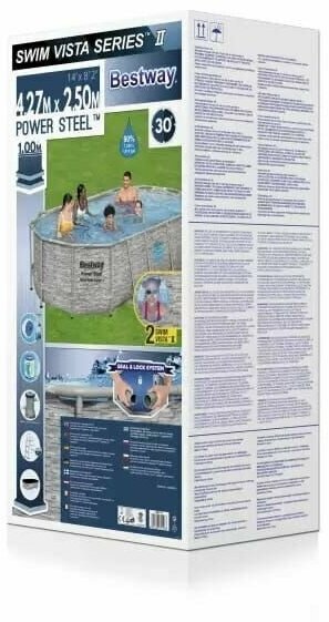Bestway Бассейн каркасный Power Steel 427х250х100 см 56714 отличается высокой прочностью и устойчивостью, а также оригинальным дизайном чаши в виде ротангового покрытия. Чаша выполнена из высококачественного трехслойного ПВХ: два слоя плотного винила и один - полиэстер для особой прочности. Каркас металлический нержавеющий оцинкованный. Не требует бетонирования и подготовки ямы, все, что нужно, это плоская, горизонтальная площадка. Сезонный бассейн (рекомендуется разбирать на холодное время года) обладает простой конструкцией - может быть легко разобран и собран заново. Время сборки и подключения бассейна не более 1-2 часов. Удобный сливной клапан позволяет присоединить садовый шланг, что дает возможность слить воду в любое место. Особенности: Размер: 427 х 250 х 100 см. Максимальные монтажные размеры: 427 x 290 см Объем при 90% заполнении: 7250 литров Внутренняя чаша бассейна из прочного трехслойного материала TriTech 2 встроенных окна в стенах бассейна Пол имитация плитки Возможна простая сборка без инструментов Чрезвычайно жесткая конструкция рамы с защитой от коррозии для повышения прочности и долговечности Система соединения стальной рамы Seal & Lock для защиты от попадания воды в стрелу Повышенное сопротивление за счет гибких тройников на углах бассейна Лента ПВХ обеспечивает дополнительную устойчивость боковых стенок. Встроенный сливной клапан с адаптером для садового шланга. В комплекте: Бассейн Фильтр-насос 2,006 л/ч Картридж фильтра Лестница 107 см Поплавок-дозатор Тент Ремкомплект Инструкция.