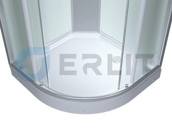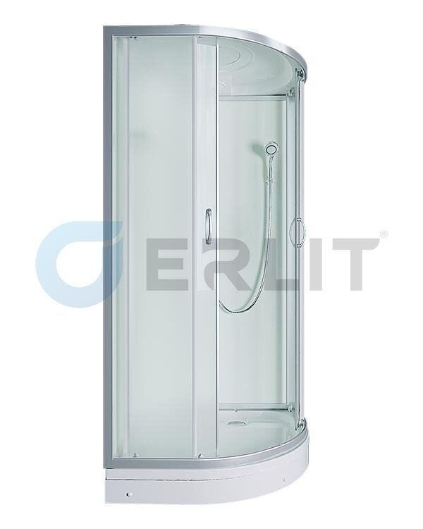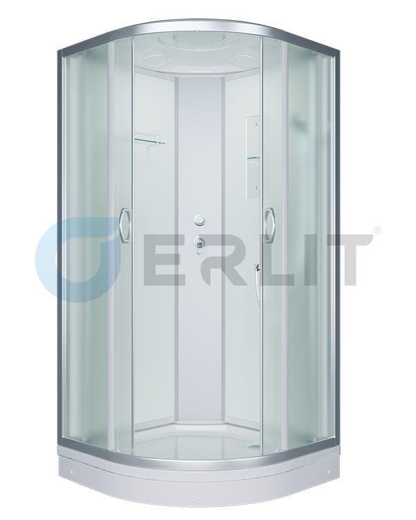 Душевая кабина Erlit Comfort ER3508P-C3 в форме четверти круга предназначена для углового монтажа в ванной комнате. Она установлена на низкий поддон из белого акрила, который не изнашивается и хорошо сохраняет тепло.