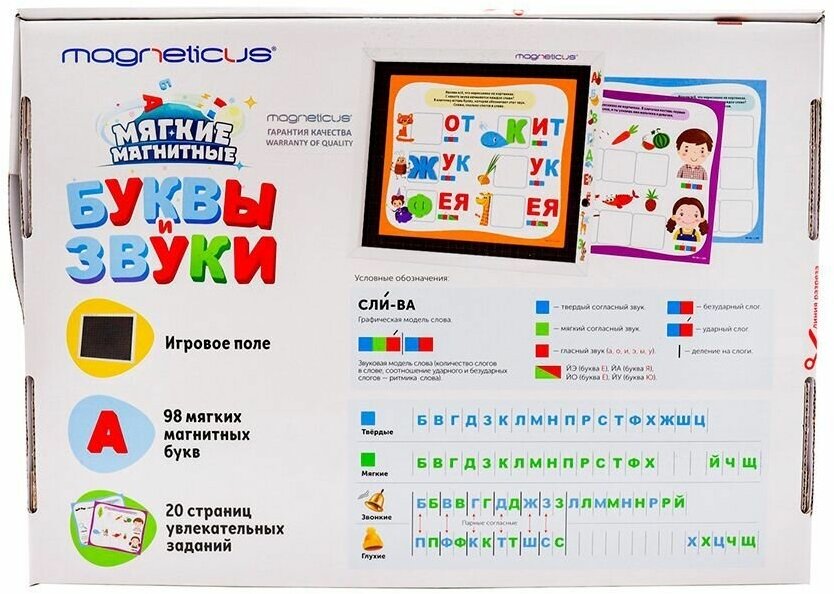 В комплекте: игровое поле, 20 страниц с заданиями, 98 магнитных букв.