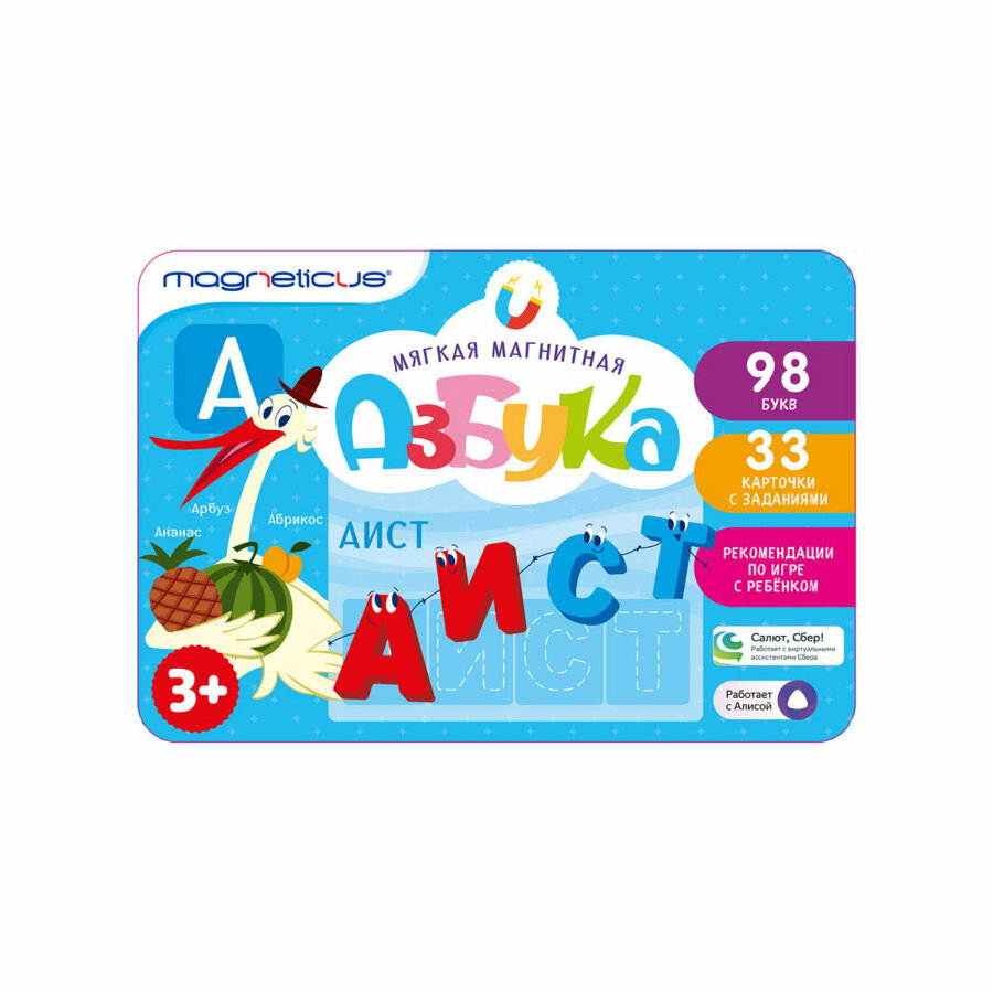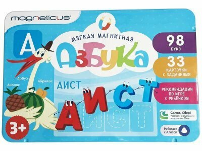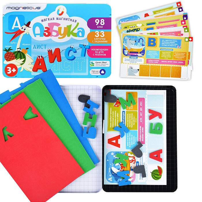 В состав мягкой магнитной азбуки входит 98 букв, 33 карточки с заданиями и рекомендации по игре с ребенком. Ребенок может самостоятельно играть и изучать буквы, так как набор работает с виртуальными ассистентами Сбера и умной колонкой Алиса. Все элементы изготовлены из безопасных и гипоаллергенных материалов.