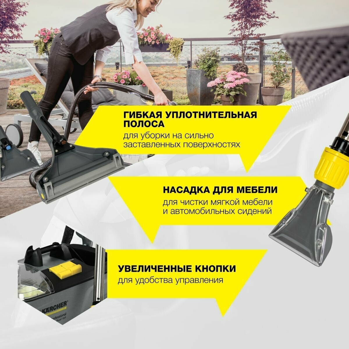 Профессиональный моющий пылесос Керхер, гарантия до 2 лет при условии регистрации на сайте. Пылесос с практичными держателями для насадок и кабеля. Идеальное решение для чистки текстильных поверхностей любых видов.